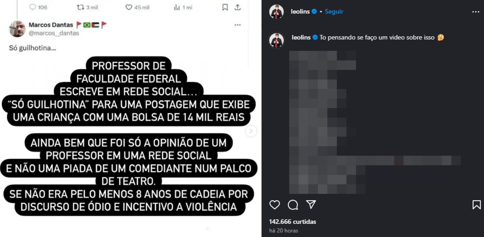 Diante de todo o burburinho, o comediante resolveu comentar o assunto por meio dos stories do Instagram, fazendo uma comparação da polêmica com seus próprios problemas na Justiça. “Professor de faculdade federal escreve em rede social ‘só guilhotina’ para uma postagem que exibe uma criança com uma bolsa de 14 mil reais. Ainda bem que foi só a opinião de um professor em uma rede social e não uma piada de um comediante num palco de teatro, senão era pelo menos 8 anos de cadeia por discurso de ódio e incentivo à violência”, escreveu o humorista, em tom de ironia.