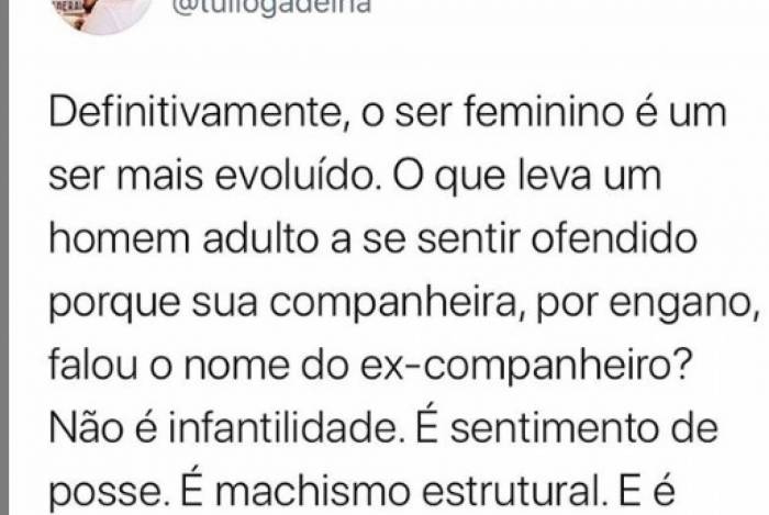 Túlio Gadêlha não aguentou ver a namorada Fátima Bernardes ser criticada nas redes sociais por ter trocado o nome dele pelo ex-marido, William Bonner, durante uma live e saiu em defesa da apresentadora. O 'Definitivamente, o ser feminino é um ser mais evoluído. O que leva a um homem adulto se sentir ofendido porque sua companheira, por engano, falou o nome do ex-companheiro? Não é infantilidade. É sentimento de posse. É machismo natural. E é insegurança também", escreveu Túlio.