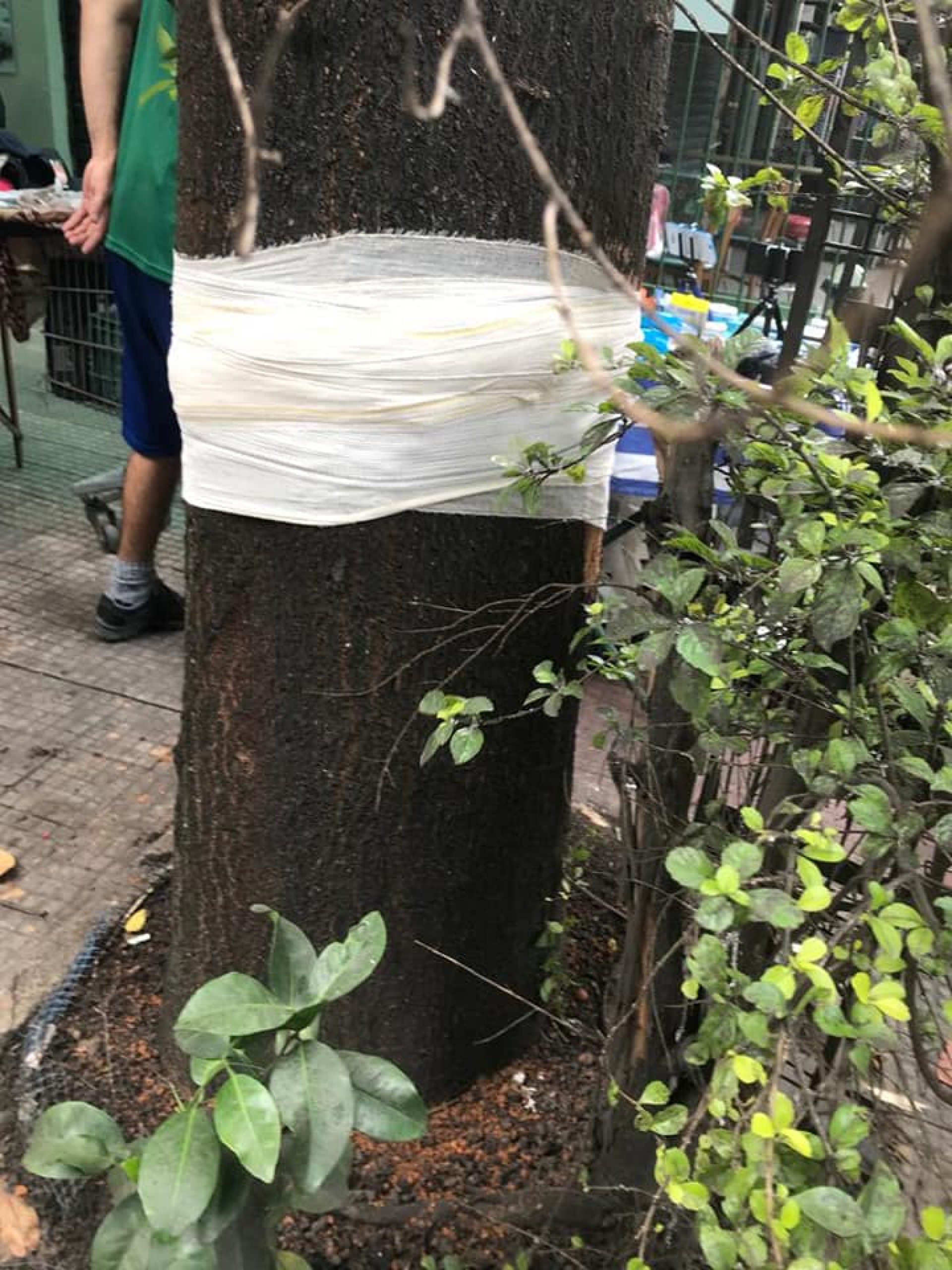 Ao saber disso, o líder do Projeto Reflorestamento Urbano da Zona Sul, José Guimarães, foi até o local e fez um curativo (preenchendo o buraco na árvore com barro, umedecendo e colocando um pano), para reverter a tentativa de matar a espécie.