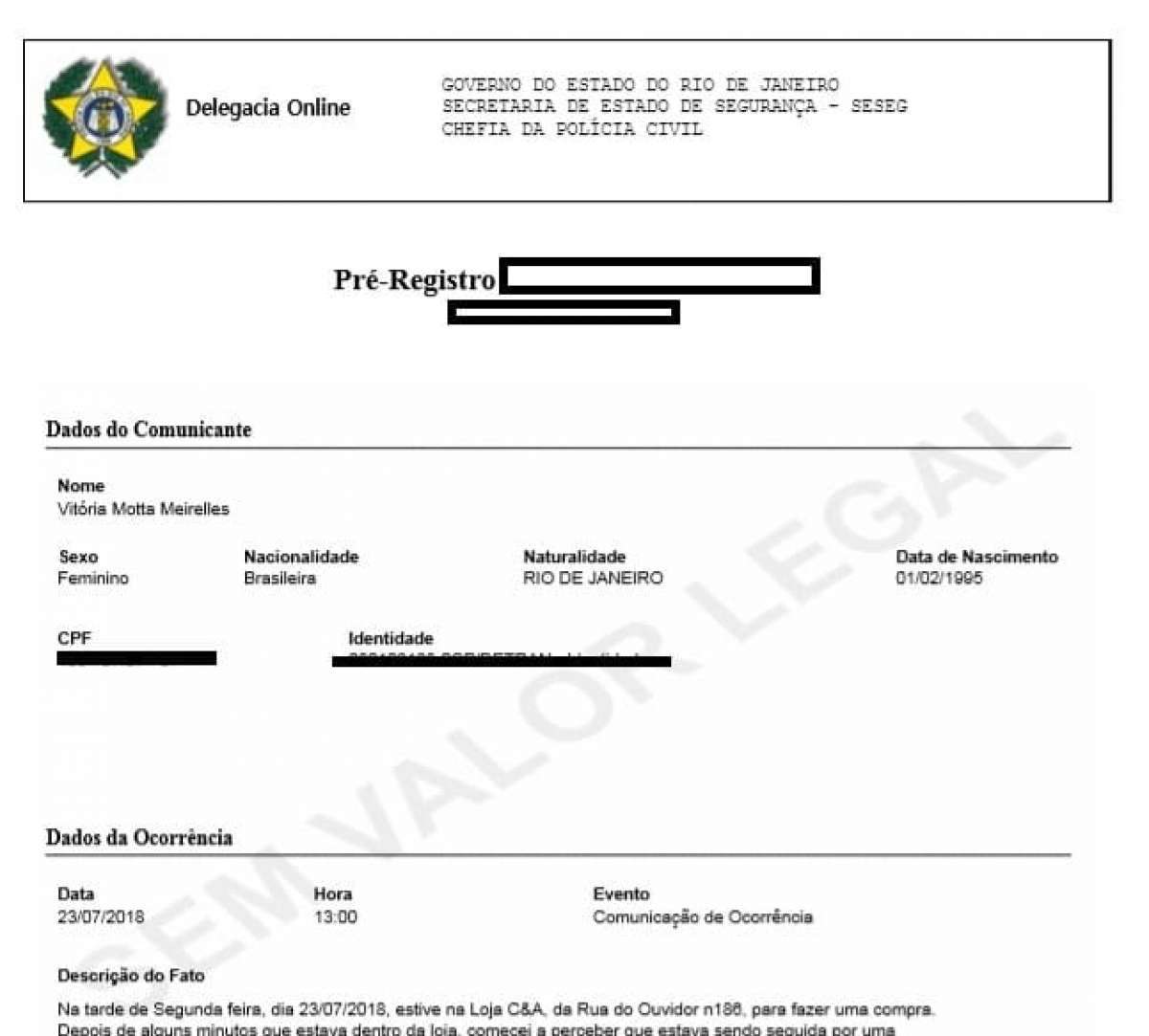 "Fiz o pré-registro de ocorrência on-line, porque assim fui orientada por um profissional da 5ª Delegacia Policial, no centro do Rio, onde tentei registrar a ocorrência na tarde de terça-feira, 24. Fui muito bem recebida e orientada que este procedimento teria que ser feito on-line."