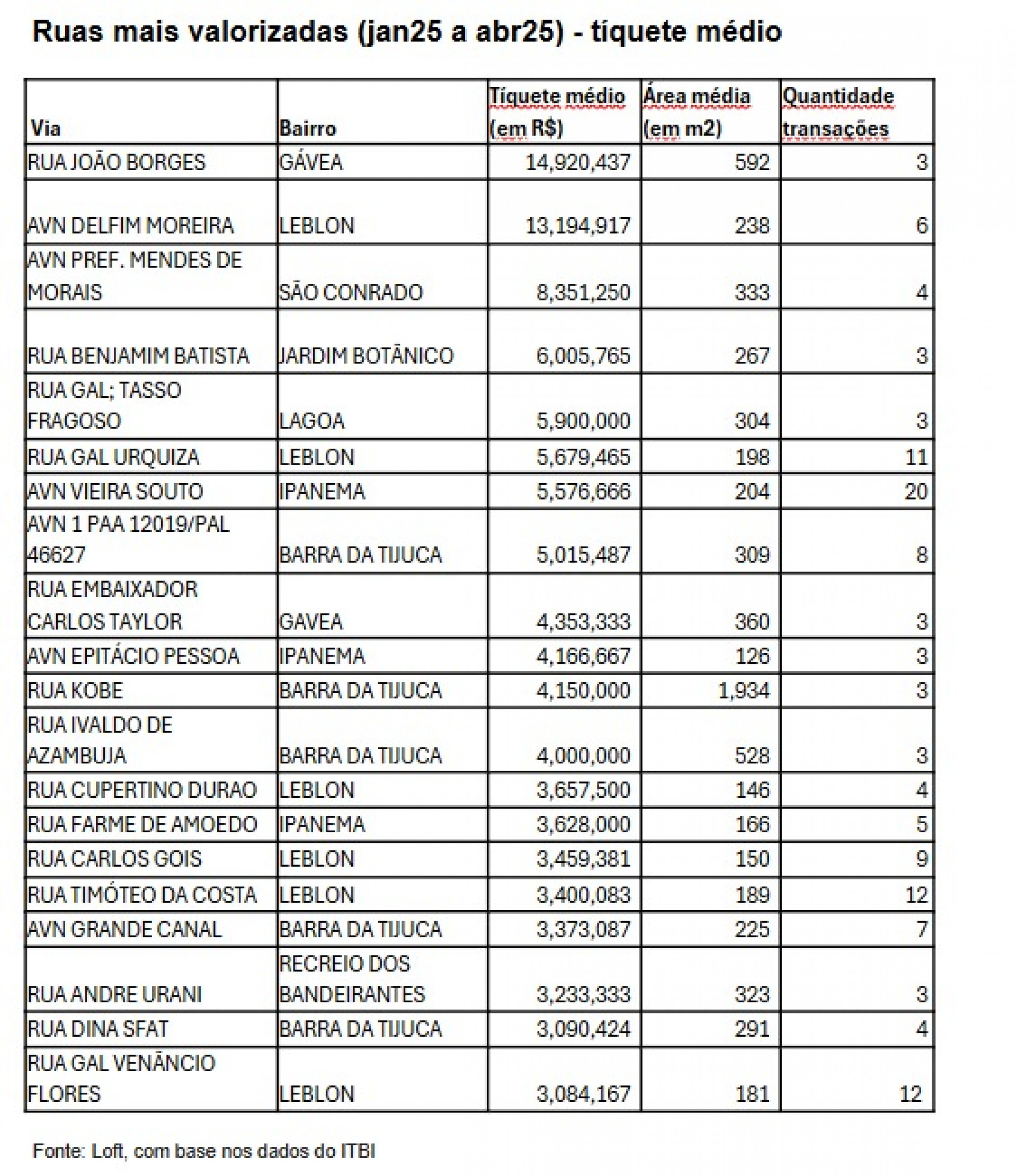 O estudo aponta ainda que, entre os bairros com maior presença no ranking por tíquete médio, o Leblon aparece com seis ruas, seguido pela Barra da Tijuca (cinco ruas), Ipanema (três ruas) e Gávea (duas ruas). Também estão representados São Conrado, Jardim Botânico e Lagoa. Confira a tabela completa: