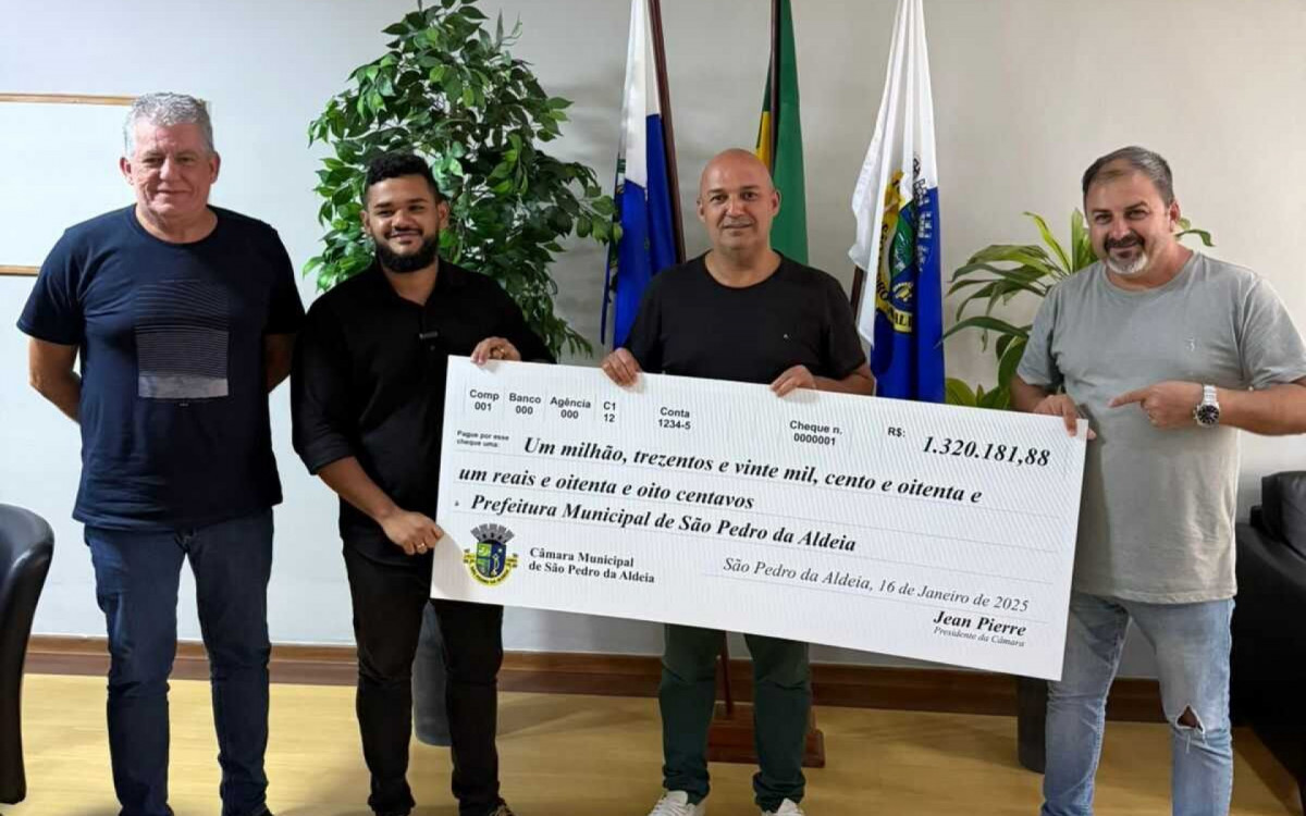 O prefeito Fábio do Pastel (PL) recebeu das mãos do atual presidente da Câmara de Vereadores de São Pedro da Aldeia, Jean Pierre (PP), um cheque de devolução no valor de R$1.320.181,88. O montante é referente ao duodécimo, repassado anualmente pela Prefeitura Municipal, que não foi executado ao longo do exercício financeiro de 2024. A entrega foi realizada nesta quinta-feira (16), no gabinete do prefeito, com a presença do secretário de Governo, Luiz Fernando Jr., do chefe de gabinete, Fernando Frauches, e do vereador Márcio Soares (PL).