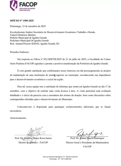 A articulação para a visita partiu do secretário de Desenvolvimento Econômico, Vantoil Martins, ex-prefeito de Iguaba, que tem amizade de longa data com um professor da instituição. Em entrevista por telefone, ele afirmou que os diretores da Facop ficaram “muito empolgados” com as possibilidades apresentadas e destacou que há 90% de chance da instalação do polo na cidade.