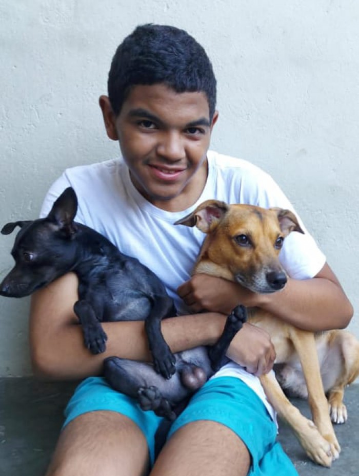 Estudante Ygor de Jesus Tavares, de 14 anos, com seus dois cachorrinhos, foi resgatado dormindo ao relento às margens da Lagoa Rodrigo de Freitas, na Zona Sul, após ficar dois dias desaparecidoArquivo Pessoal