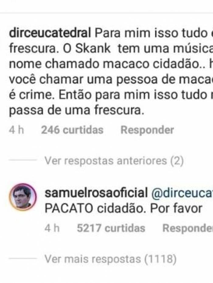 "Pacato Cidadão, por favor", disse o cantor. A resposta de Samuel teve quase seis mil curtidas. "Você é o maior. Continua amassando todo mundo", disse um admirador. "Eu admiro tanto a paciência do Samuel. Morri mil vezes", disse outra pessoa.