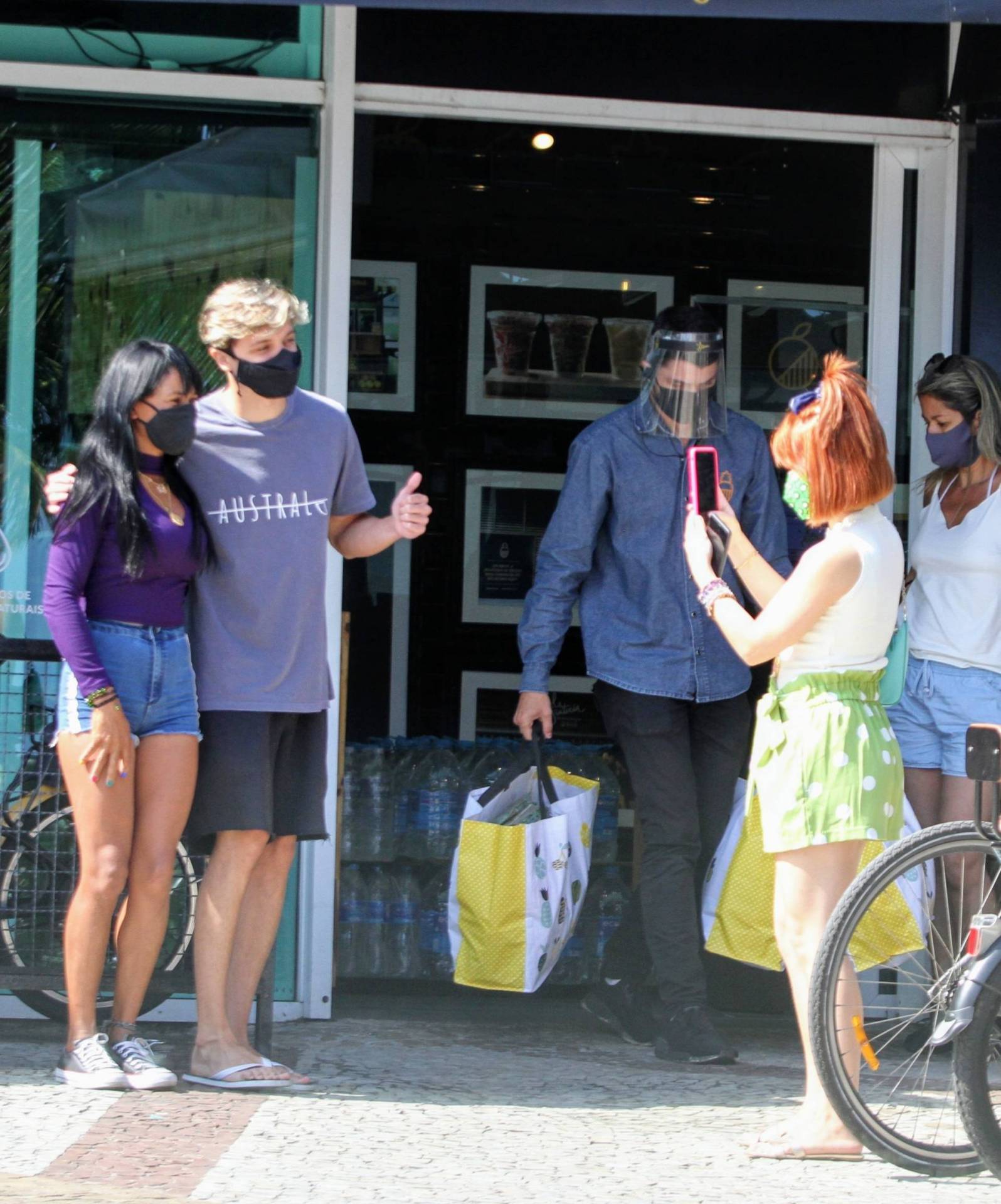 Seguindo os protocolos de segurança contra o novo coronavírus, Larissa e Léo utilizaram máscara de proteção durante todo o tempo em que estiveram dentro e fora do mercado.