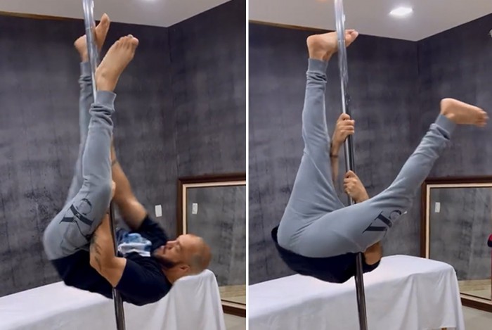 "Canta e ainda dança pole. Tudão mesmo, Belo", escreveu Gracyanne na legenda do vídeo, em que Belo aparece de cabeça para baixo na barra.