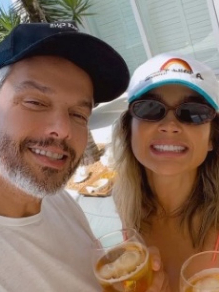 "Flavia Alessandra se preparando para brilhar. Olha que linda, gente. Olha que lindo esse biquíni", disse ele, desconcertado com a beleza da esposa. Depois, os dois aproveitaram para se refrescar na piscina.