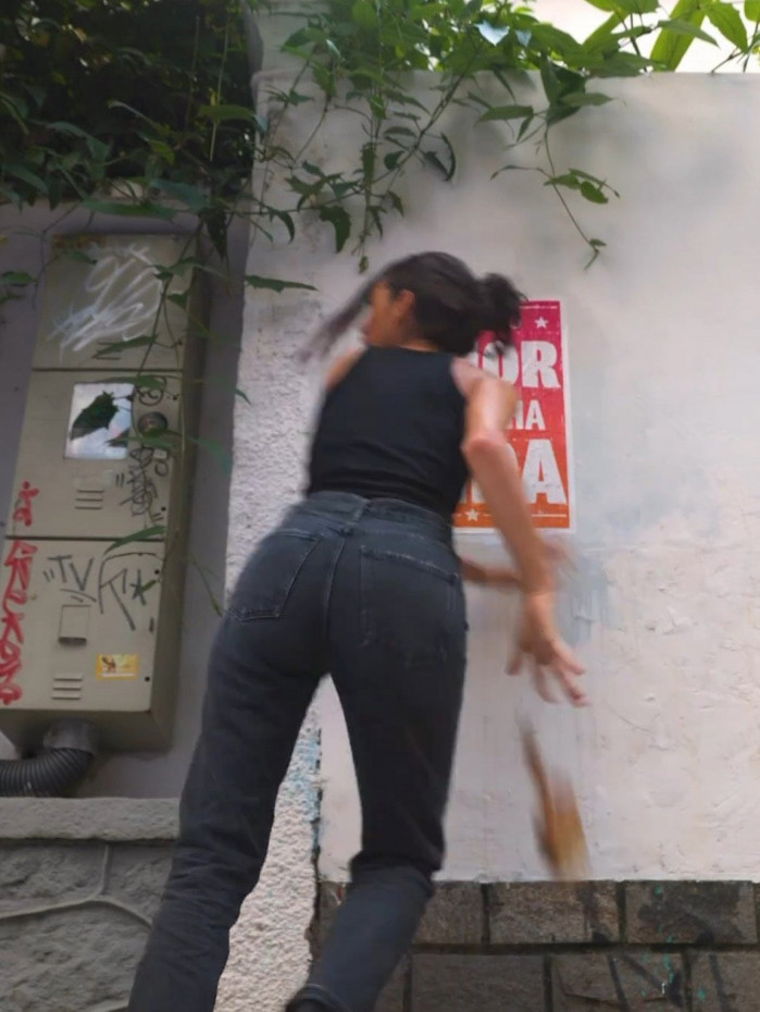 Nas imagens a atriz aparece colando um lambe-lambe, espécie de propaganda, em uma parede com a citação "Procuro o amor da minha vida". Em seguida, saí correndo e deixa o pincel de cola cair, como se fugisse de alguém.