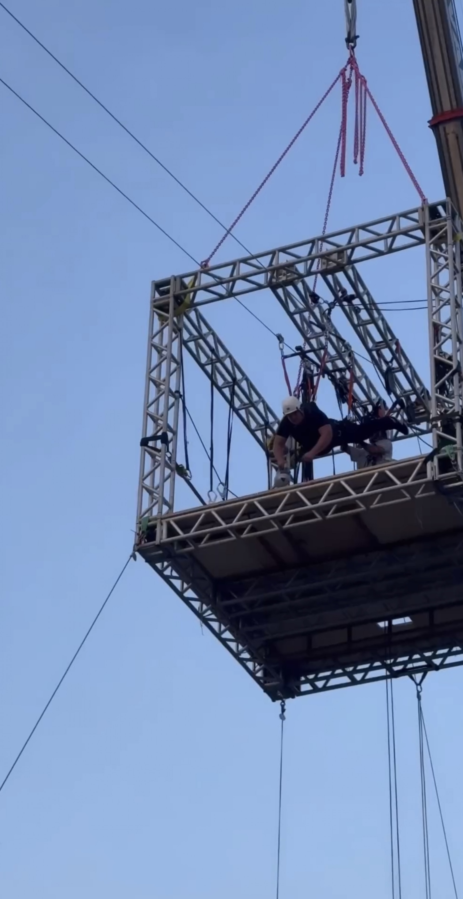 No vídeo, é possível ver que os participantes devem ficar pendurados no alto por um guindaste enquanto seguram objetos.