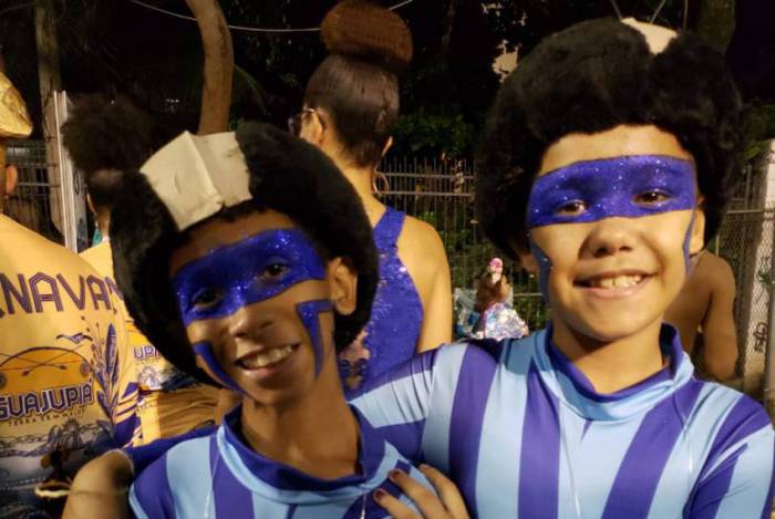 Isabella Vitória, 11, e Bernardo Régis, 10, foram convidados para serem guardiões da porta-bandeira Lucinha Nobre - Beatriz Perez