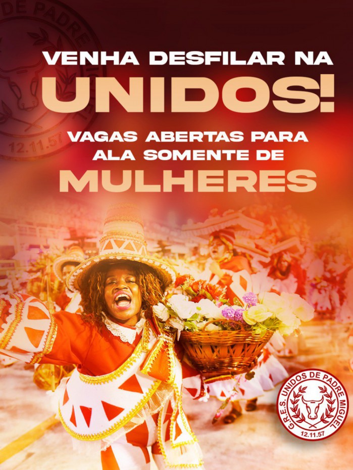 Rio - A Unidos de Padre Miguel está com vagas abertas para mulheres que desejam participar do desfile da agremiação no próximo carnaval. A escola da Vila Vintém terá uma ala exclusivamente feminina. A seleção não tem nenhum pré-requisito quanto ao porte físico. As inscrições devem ser feitas diretamente com a direção de harmonia da escola, antes de qualquer ensaio do Boi Vermelho.