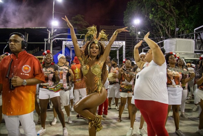Rio - Erika Januza deu show de samba no pé e roubou todos os holofotes no ensaio técnico da Viradouro, na Marquês de Sapucaí, na noite deste domingo. A rainha de bateria da agremiação de Niterói chamou atenção com um modelito dourado e cheio de brilho. Lore Improta, que é musa da Viradouro, também participou do ensaio. Ela escolheu um short jeans e uma blusa branca com pedrarias para desfilar na Avenida.