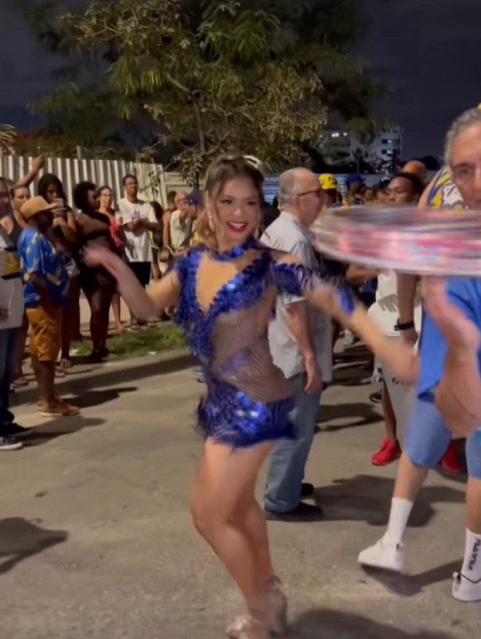 Cantora é rainha de bateria da agremiação e participou de ensaio de rua na noite desta quarta-feira