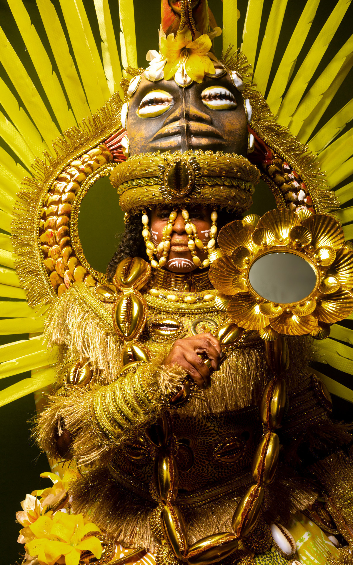 A fantasia de abertura representa Oxum, deusa das águas doces, trazendo predominantemente tons dourados para simbolizar beleza, força feminina e ancestralidade, elementos centrais na obra da autora.