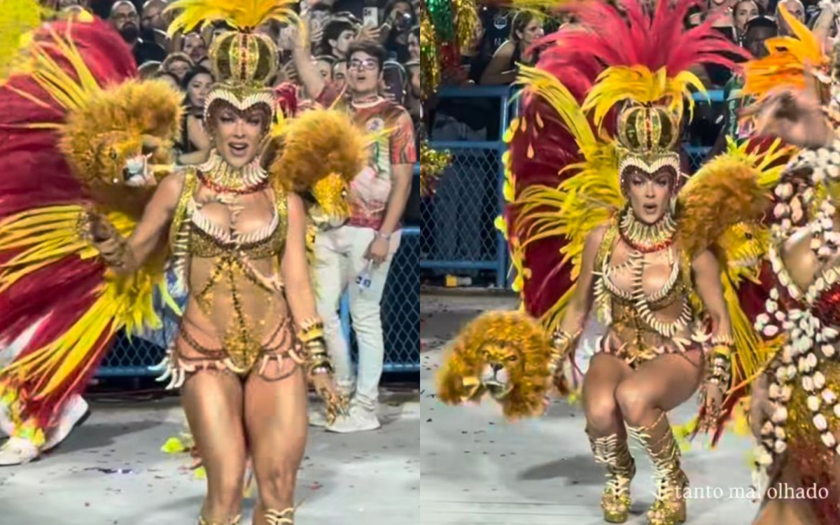 Nas imagens compartilhadas pela própria influenciadora nas redes sociais, é possível ver o momento em que uma das ombreiras, adornada com uma cabeça de leão, cai enquanto ela atravessa o Sambódromo. Ao publicar o vídeo, Jaquelline comentou o ocorrido com ironia: “É tanto mau-olhado”.