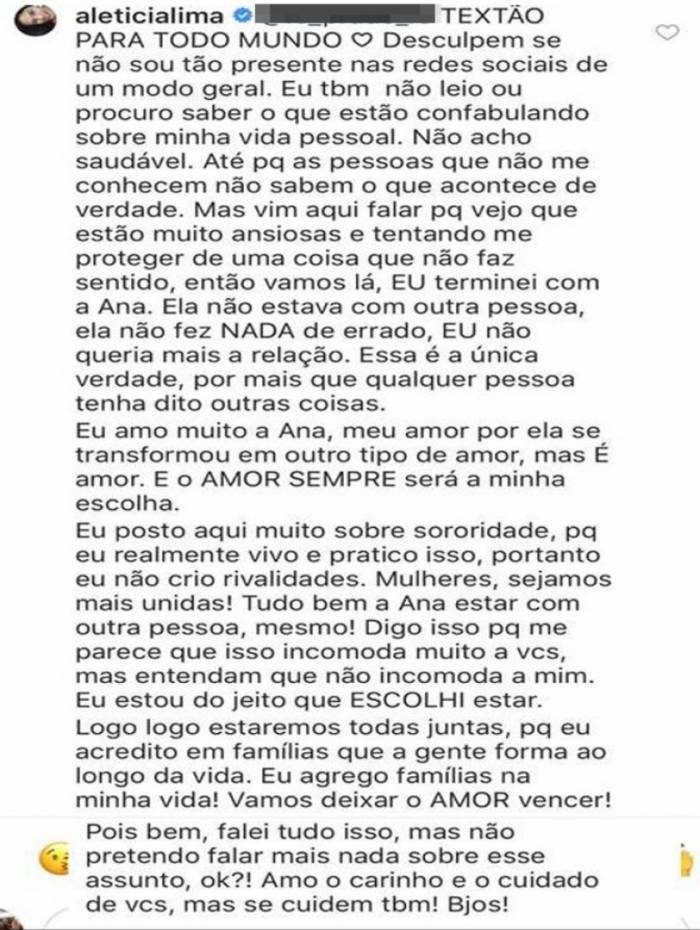 "Eu terminei com a Ana. Ela não estava com outra pessoa. Ela não fez nada de errado. Eu não queria mais a relação. Essa é a única verdade, por mais que qualquer pessoa tenha dito outras coisas. Eu amo muito a Ana, meu amor por ela se transformou em outro tipo de amor, mas é amor. E amor sempre será a minha escolha", escreveu Letícia.