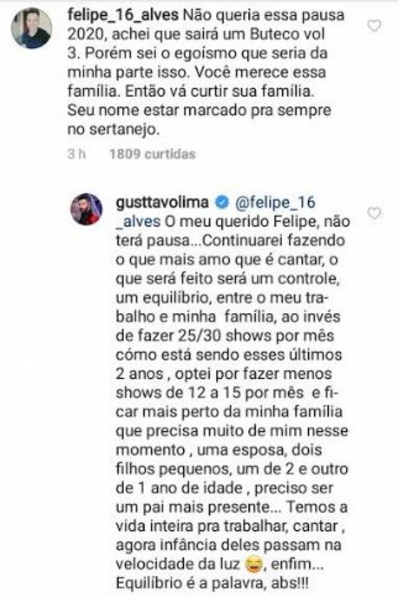 Ao receber um comentário de um seguidor lamentando a "pausa" na carreira, Gusttavo esclareceu que vai ser apenas uma redução na agenda. A esposa do cantor apoiou a resposta ao fã.