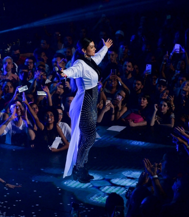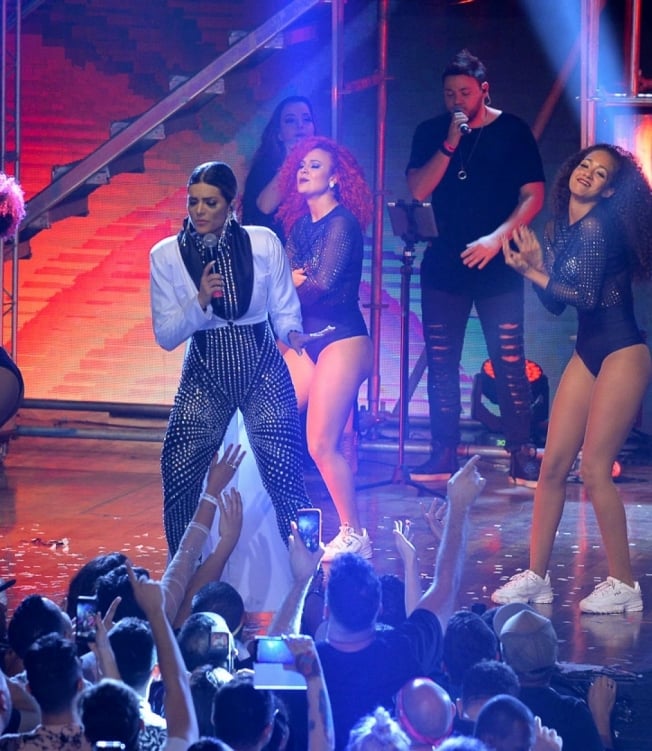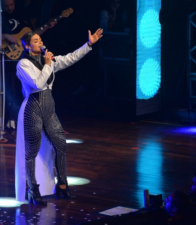Kelly Key usa camisa estampada com sua foto para 'Playboy' em show
