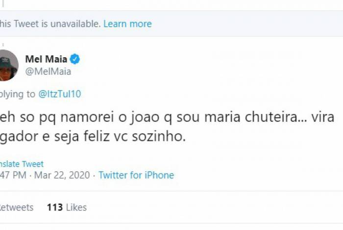 "Vou virar jogador e ainda vou ficar com você", disse o rapaz, que acabou apagando a postagem depois. "Não é só porque eu namorei o João que sou Maria Chuteira. Vira jogador e seja feliz você sozinho", disparou Mel Maia.