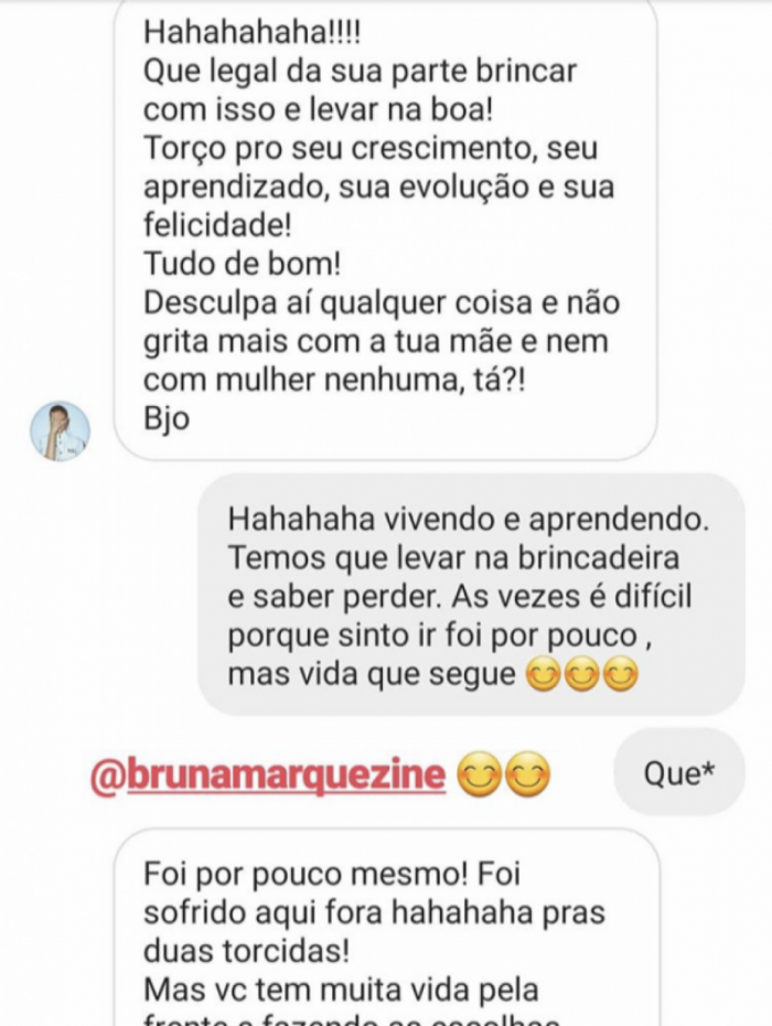 Bruna viu o vídeo e respondeu a mensagem de Prior. "Hahahaha! Que legal da sua parte brincar com isso e levar na boa! Torço pro seu crescimento, seu aprendizado, sua evolução e sua felicidade! Tudo de bom! Desculpa aí qualquer coisa e não grita mais com a tua mãe e nem com mulher nenhuma, tá? Beijo", escreveu a atriz em mensagem direta.