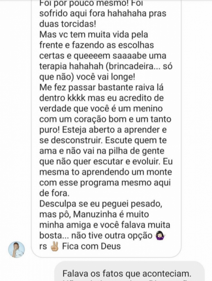 "Foi por pouco mesmo, foi sofrido aqui fora para as duas torcidas. Mas você tem muita vida pela frente e fazendo as escolhas certas e quem sabe uma terapia (brincadeira... só que não) você vai longe! Me fez passar bastante raiva lá dentro (risos) mas eu acredito que você é um menino com um coração bom e um tanto puro. Esteja aberto a aprender e se desconstruir. Escute quem te ama e não vai na pilha de gente que não quer escutar e evoluir. Eu mesma estou aprendendo um monte de coisa com esse programa mesmo aqui de fora. Desculpa se eu peguei pesado, mas pô, Manuzinha é muito minha amiga e você falava muita bosta. Não tive outra opção. Fica com Deus", disse a atriz.
