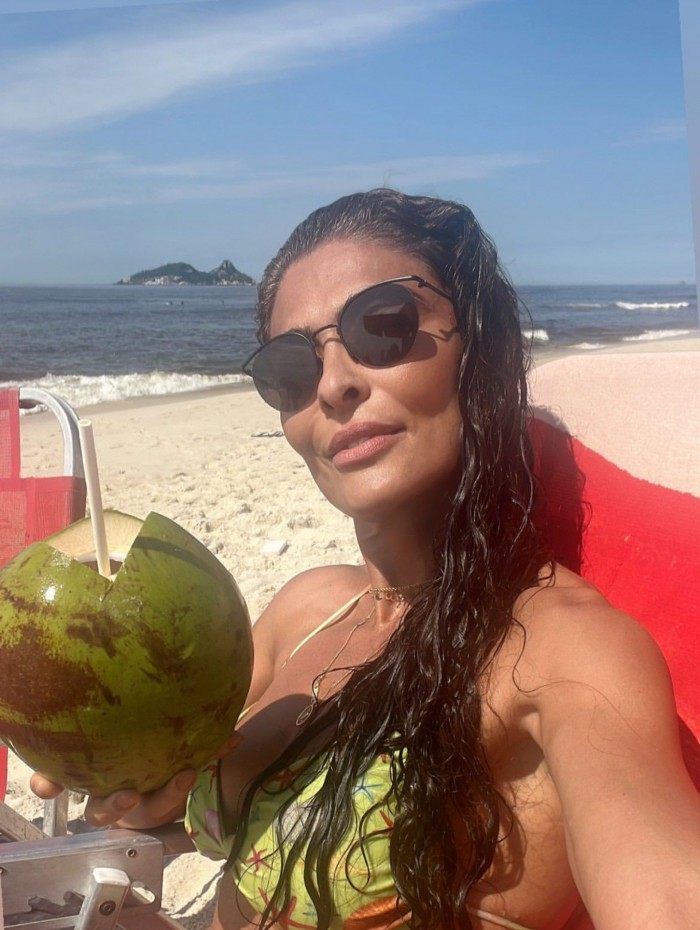 Sol e mar! Juliana Paes toma água de coco e mostra barriga chapada em praia