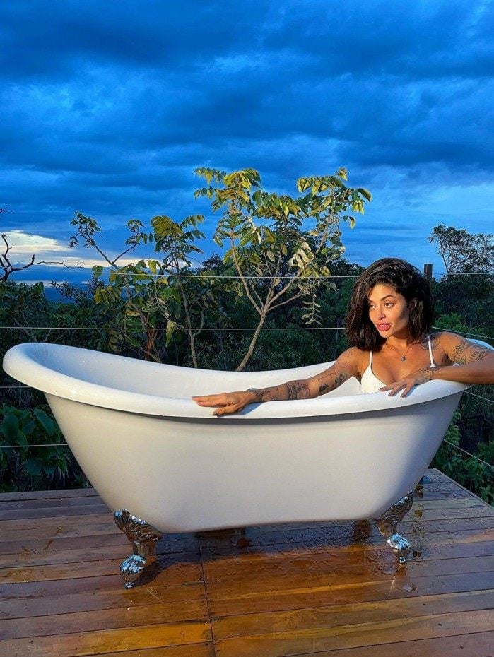 Rio - Aline Campos compartilhou cliques dentro de uma banheira nesta quarta-feira. A influenciadora, que assinava como Aline Riscado anteriormente, surgiu de biquíni branco em meio ao cenário paradisíaco da Chapada dos Veadeiros, destino turístico de Goiás.