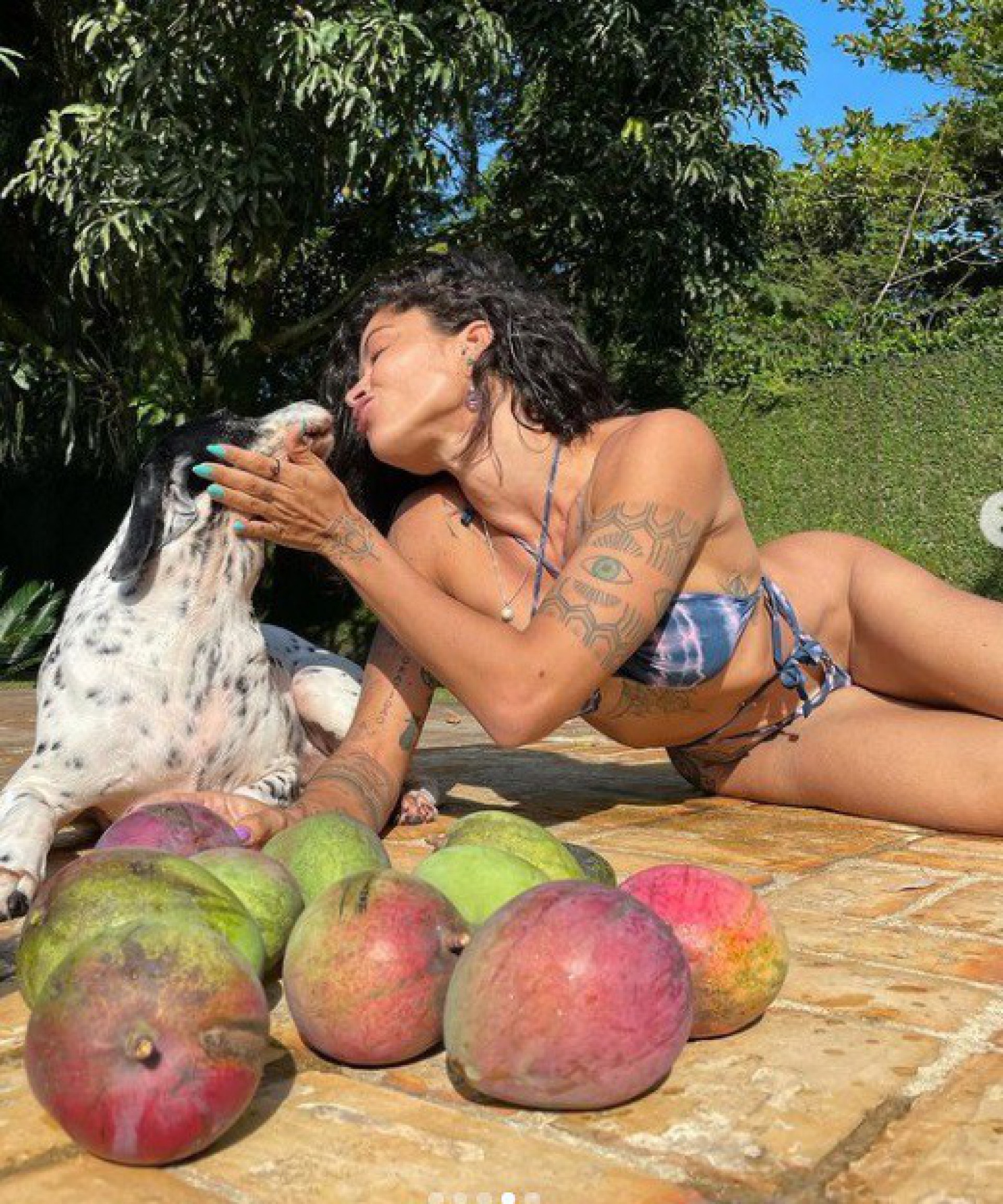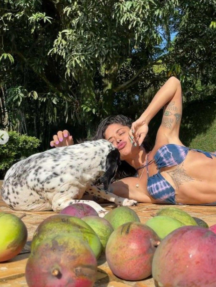 "Um final de semana com muita manga e amor!", escreveu ela fazendo referência às frutas que também aparecem nas fotos. Não demorou muito para os internautas reagirem às imagens. "Perfeita", escreveu um. "Que cachorro de sorte", brincou outro. "É muito gata", disse um terceiro.