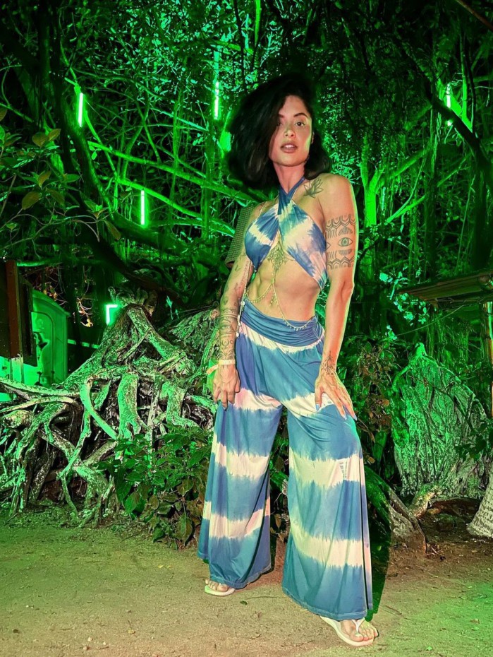 Ao postar fotos usando um conjunto de top e calça e esbanjando boa forma, Aline escreveu na legenda: "Sumi, mas não é o que vocês estão falando por ai… é que cheguei em Noronha, e a internet aqui está inexistente (ps: não vou para o BBB)".