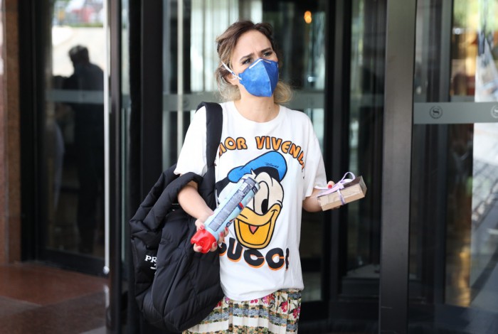 De máscara e segurando spray de álcool gel, Tatá Werneck deixa hotel em São Paulo