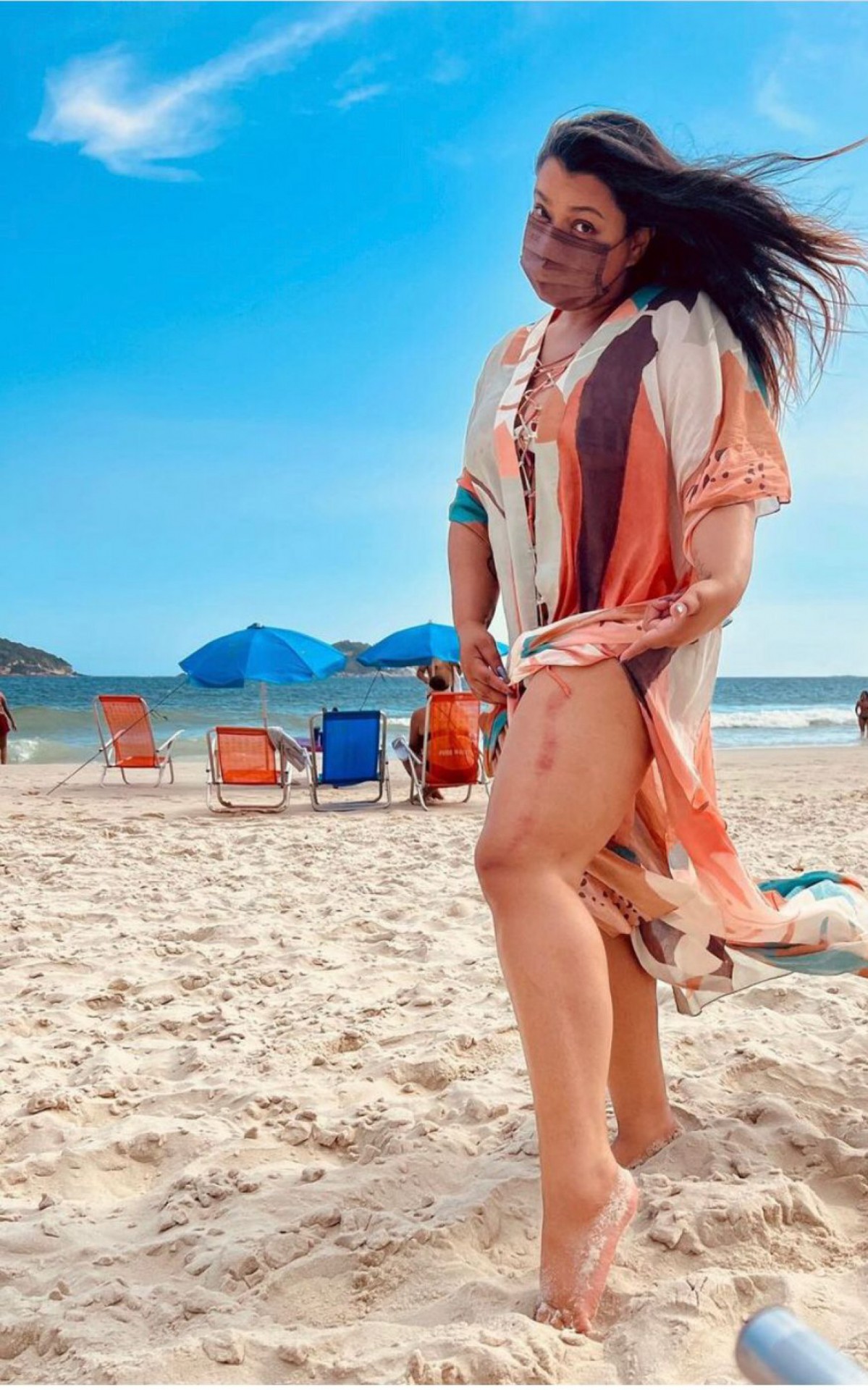 "Depois de mais de 2 anos sem pisar na areia da praia do Rio, hoje eu e a @rocha_soraya resolvemos ir!! Corre no stories pra saberem de onde vem o machucado na perna!! Só comigo!! Mas valeu", disse ela na legenda da publicação.