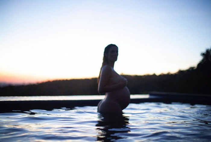 Rio - Grávida de nove meses do segundo filho, Rafa Brites, de 35 anos, encantou a web ao posar totalmente nua em uma piscina. Posicionada contra a luz do pôr-do-sol, a mamãe posou para as lentes da câmera e deixou a silhueta do barrigão em evidência.