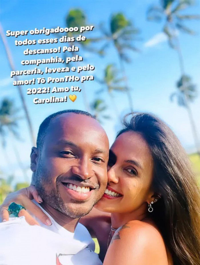 Rio - Thiaguinho usou o Instagram Stories, nesta segunda-feira, para se declarar para Carol Peixinho. O cantor publicou um clique coladinho com a amada e escreveu: "Super obrigado por todos esses dias de descanso! Pela companhia, leveza e pelo amor! To pronTHo para 2022! Amo tu, Carolina".