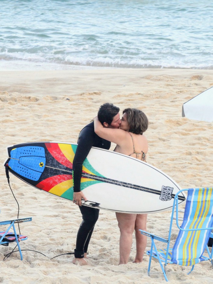 Rio - Claudia Rodrigues e a namorada, Adriane Bonato, foram clicadas em clima de romance nas areias da praia de São Conrado, na Zona Sul do Rio, na manhã deste sábado. Apaixonadas, as duas trocaram vários beijinhos. De biquíni, a humorista curtiu uns momentos de descanso sentada em uma cadeira enquanto a empresária surfava. O novo casal do pedaço ainda encontrou o ator Romulo Arantes Neto no local. Os três posaram juntinhos para uma foto feita por um paparazzo.