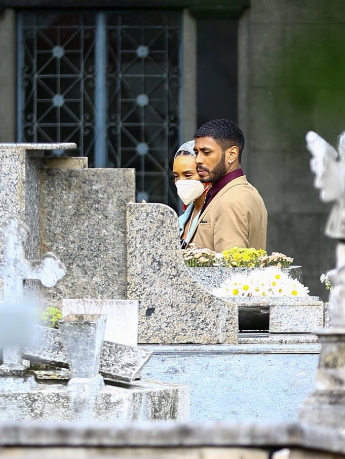 Rio - Ícaro Silva e Taís Araujo estiveram em um cemitério da Zona Norte do Rio, nesta segunda-feira, para gravar cenas da novela 'Cara e Coragem', da TV Globo. Na ocasião, a atriz, que dá vida a Anita/Clarice, usou jaqueta, calça jeans, óculos escuros e um lenço na cabeça. Já Ícaro, que interpreta Leo, optou por um blazer, camisa e calça social. Os dois foram clicados por um paparazzo. Durante a gravação, eles andaram pelas lápides e pararam em frente a um jazigo.