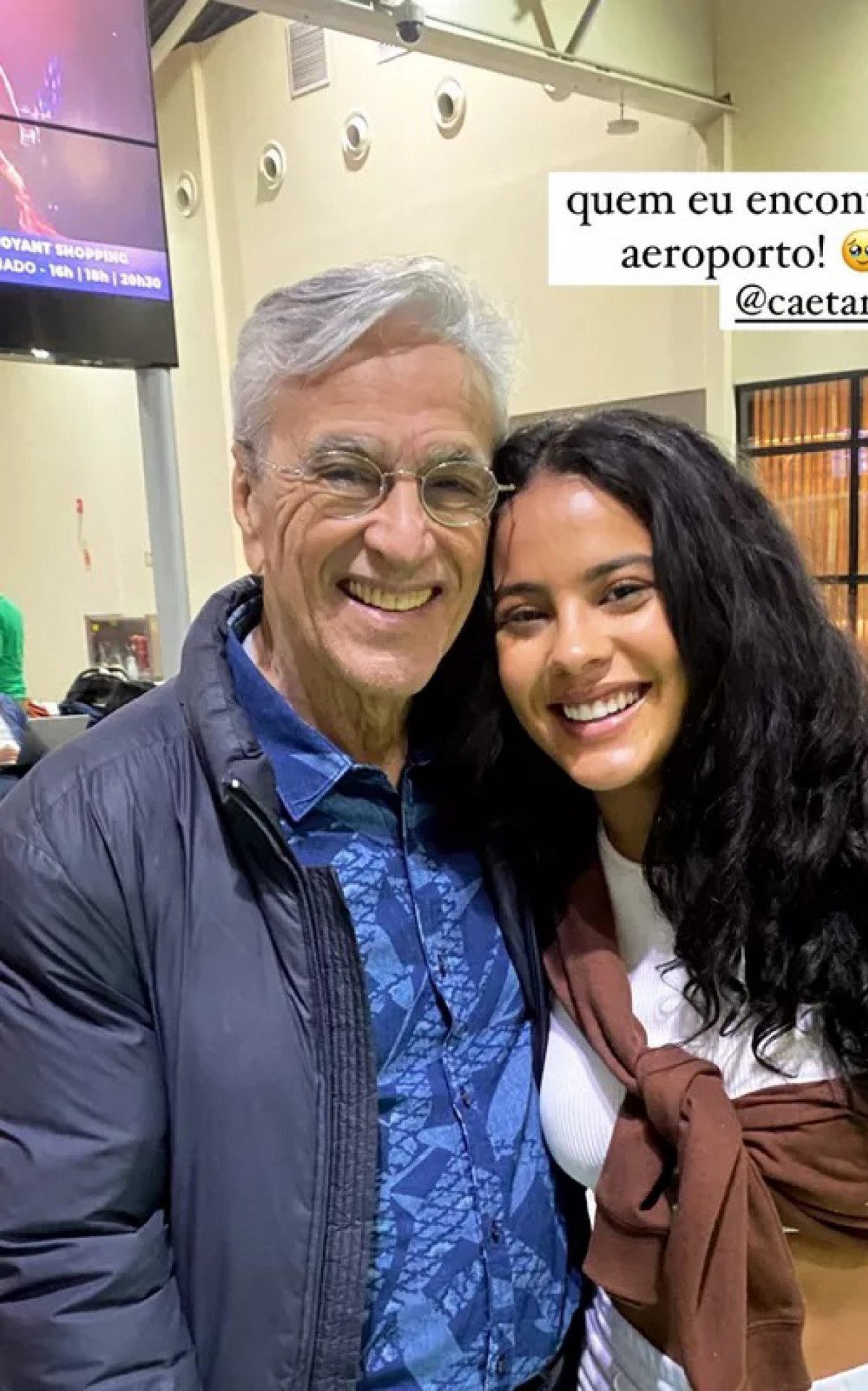 Caetano completou 80 anos no início deste mês e comemorou a data com um show na Zona Oeste do Rio. A atriz Bella Campos, assim como boa parte do elenco de "Pantanal", conferiu a apresentação. Recentemente, Bella foi alvo de rumores sobre um possível romance com o jogador de futebol Gabigol, do Flamengo.
