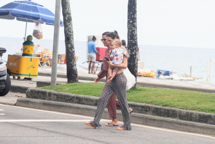 Nos cliques, a atriz apareceu usando um biquíni preto, uma calça estampada nas cores branco e preto em chinelo amarelo. Para o filho, Laura Neiva escolheu um conjuntinho branco com estampa infantil.