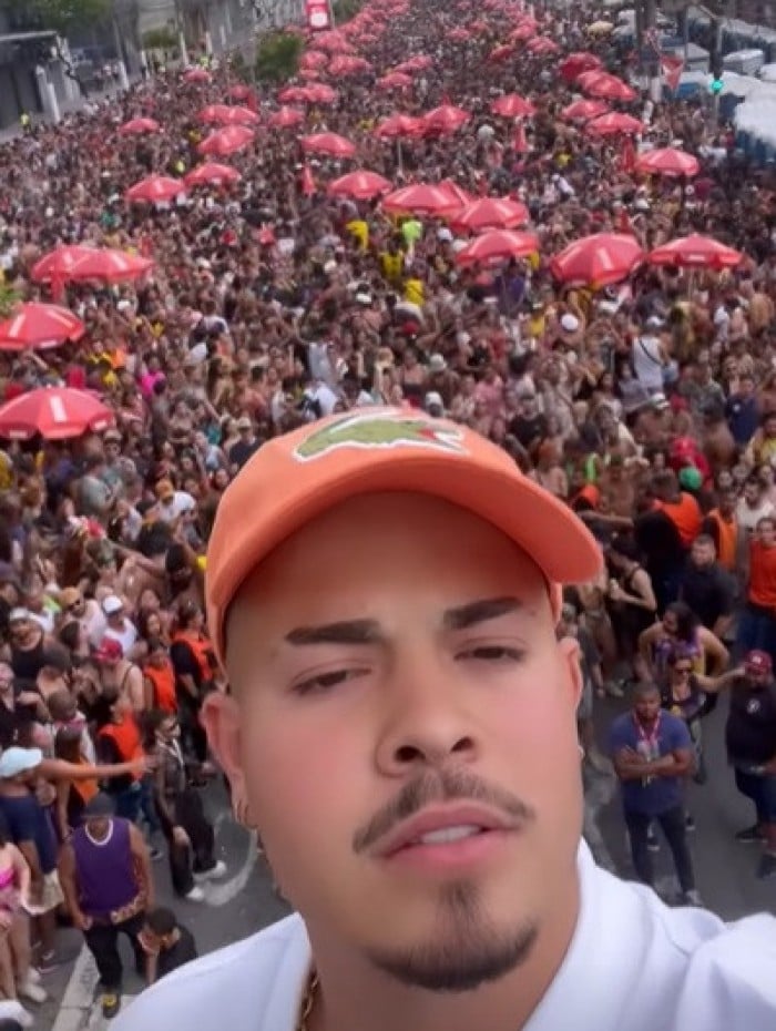 "Vim na boa vontade cantar no bloco e um arrombado pega minha lupa (óculos). Sempre tem um filho da put* para estragar o evento. Minha esposa grávida e geral empurrando para roubar. Meus documentos, minha carteira!", lamentou ele. "Bem material a gente conquista. Agora cercar eu e minha esposa grávida, empurrar, machucar os dois... Exigimos o mínimo para entregar o melhor para vocês", completou.