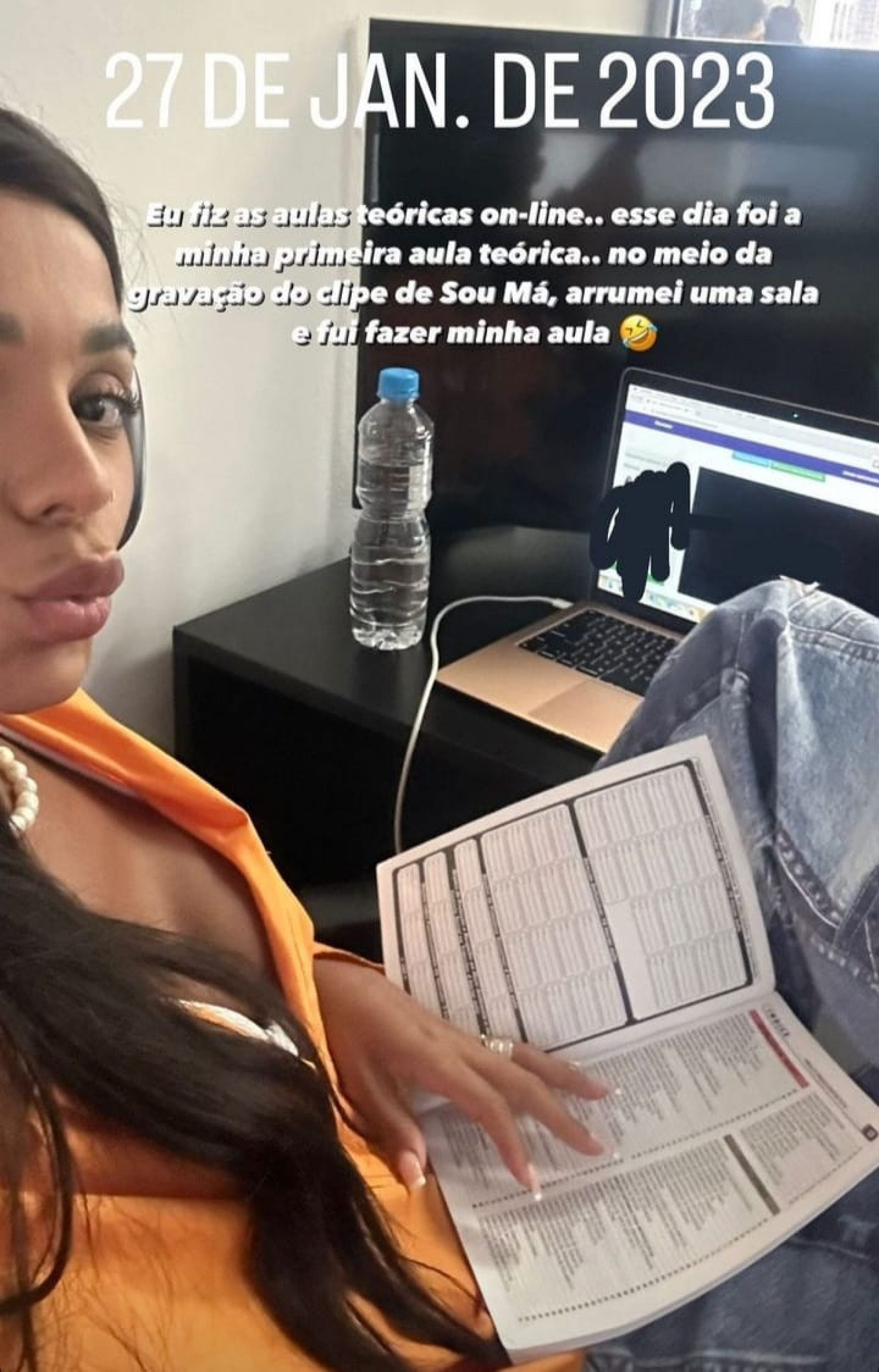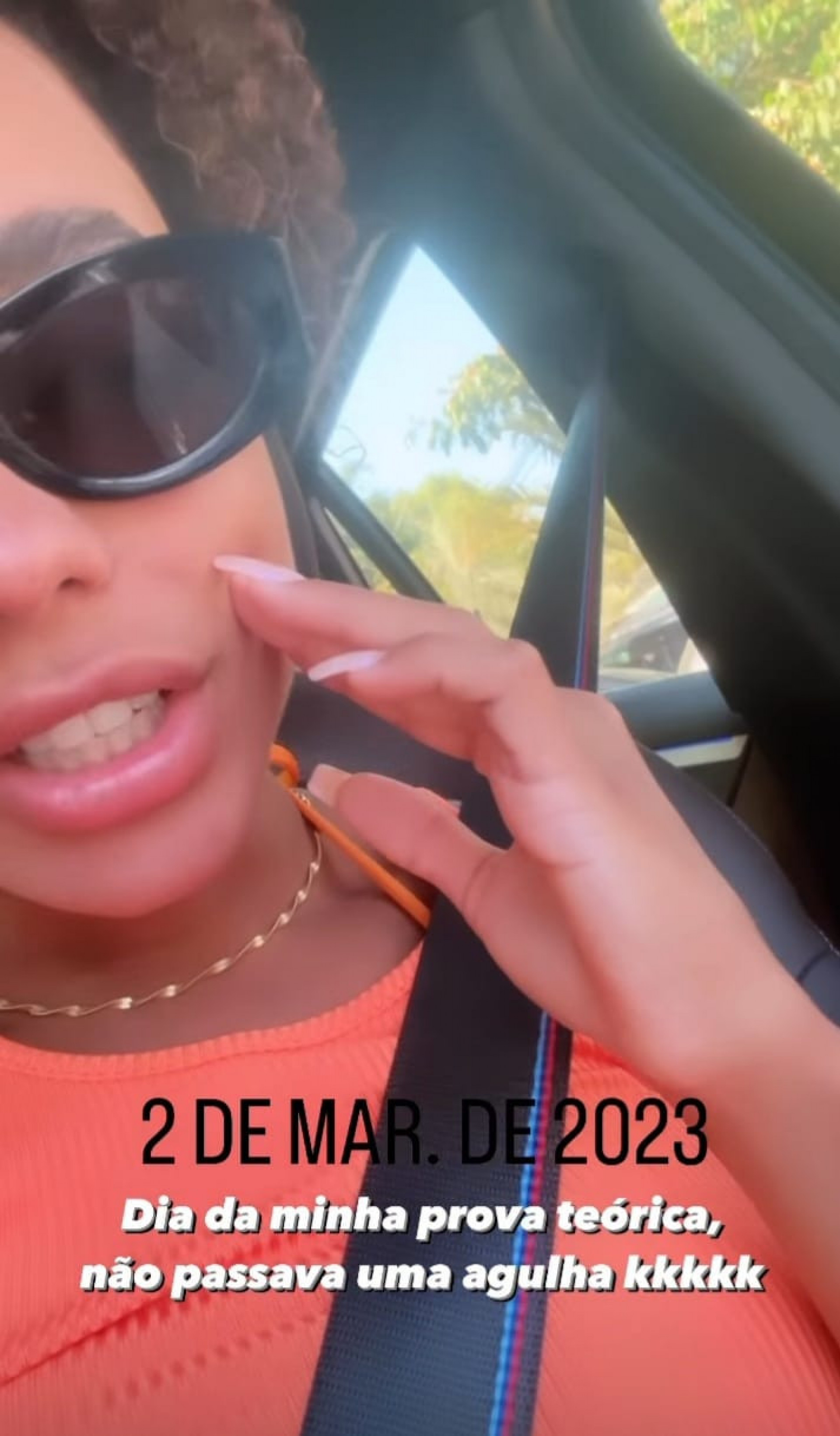 Mais cedo, Brunna Gonçalves compartilhou com os seguidores todo o processo para tirar a habilitação: as aulas online realizadas em janeiro, a prova teórica em março e, em seguida, as aulas de instrução e a aprovação na prova prática desta quinta-feira.
