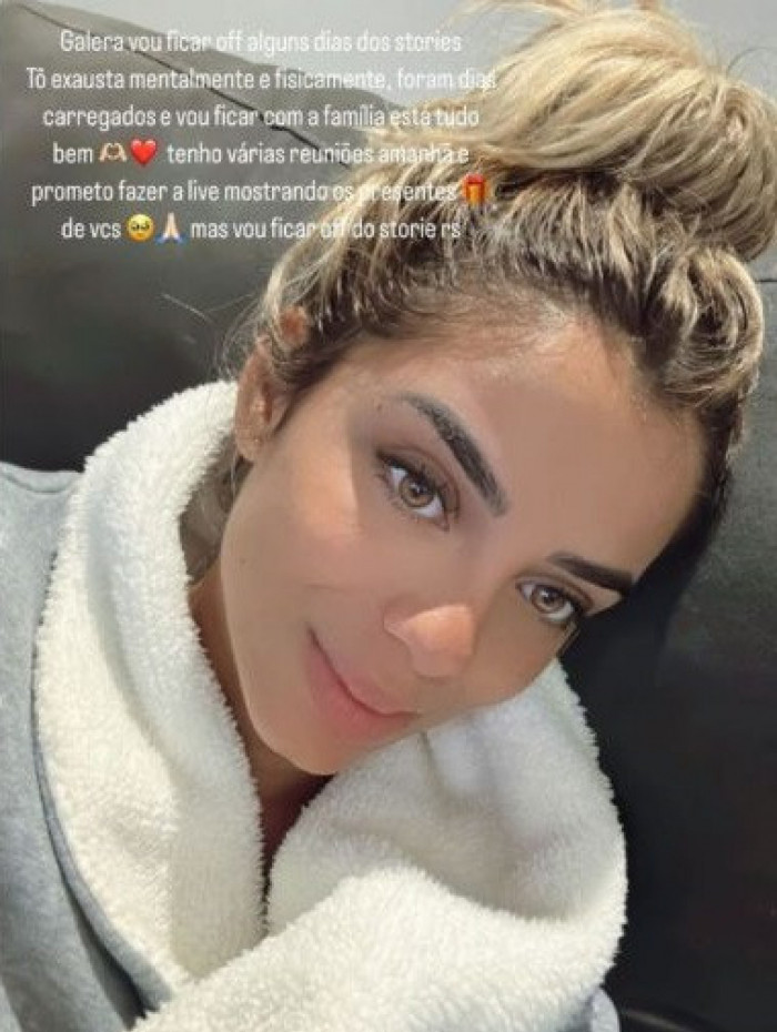 "Galera, vou ficar off alguns dias dos stories. Estou exausta mentalmente e fisicamente, foram dias carregados e vou ficar com a família, está tudo bem. Tenho várias reuniões amanhã (nesta sexta-feira) e prometo fazer live mostrando os presentes de vocês. Mas vou ficar off dos Stories", escreveu a ex-BBB, na legenda de uma foto.