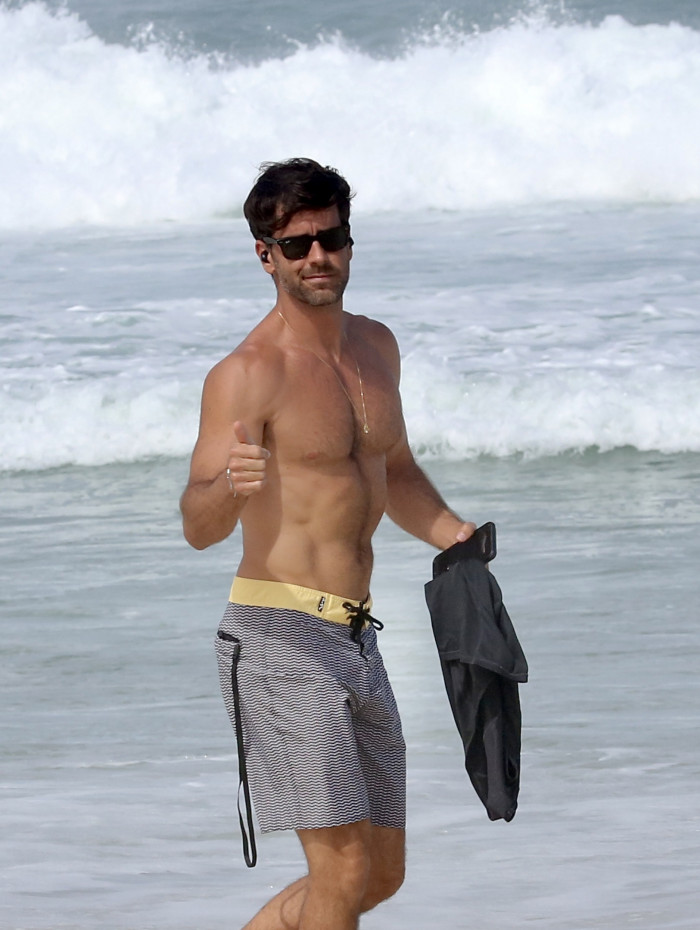 Marcos Pitombo mostra tanquinho definido em praia na Barra da Tijuca