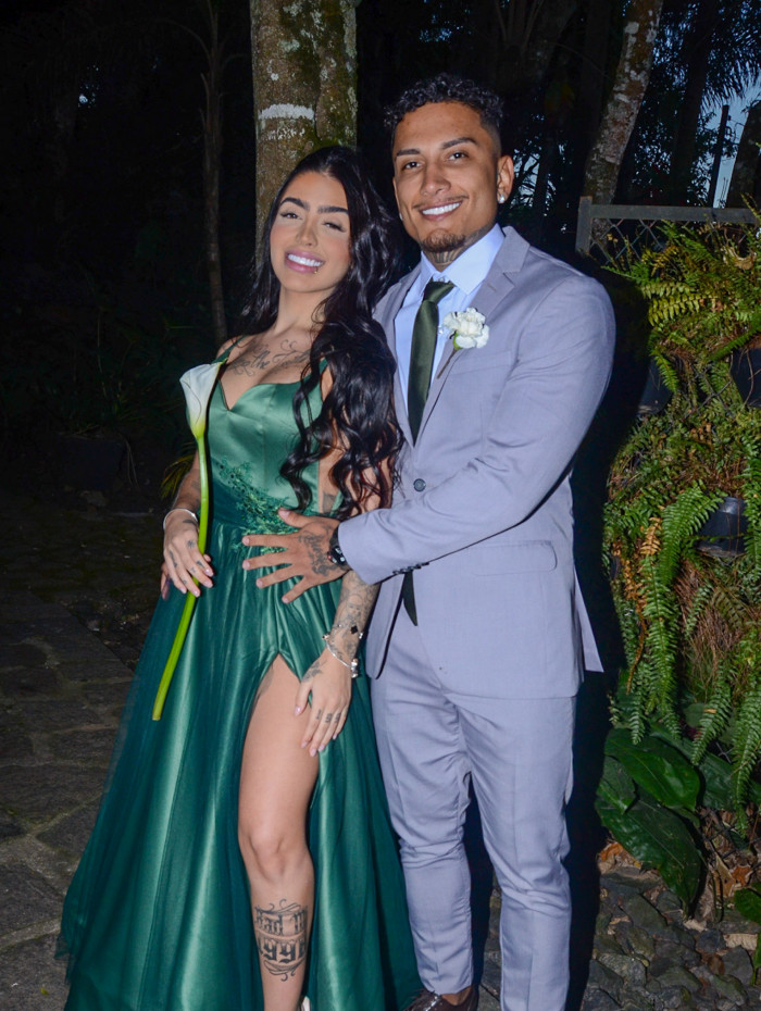 Para a ocasião, a cantora apostou em um vestido longo na cor verde, com uma fenda lateral em destaque. Já o dançarino investiu em um terno cinza com direito a uma flor na lapela.