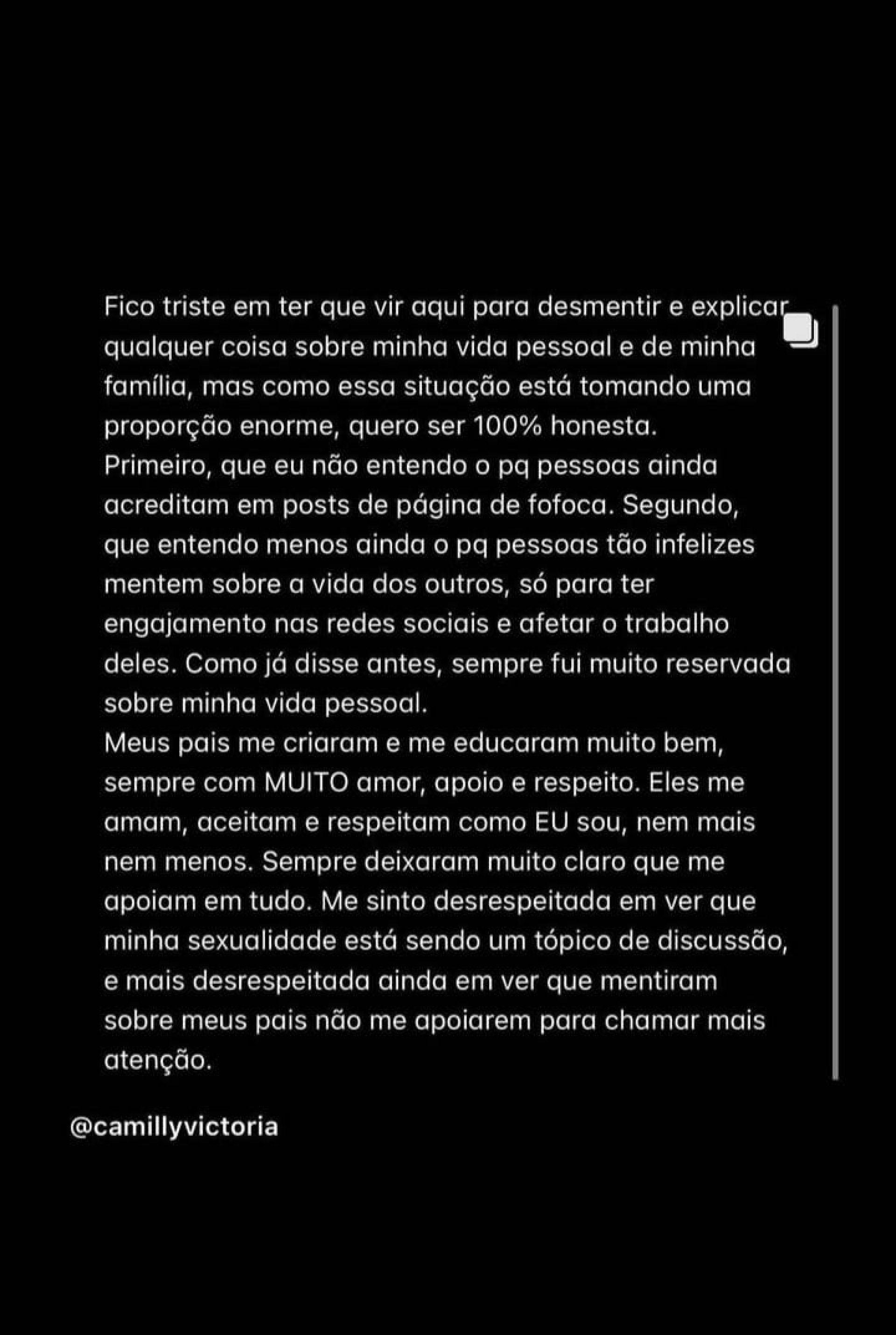 "Como já disse antes, sempre fui muito reservada sobre minha vida pessoal. Meus pais me criaram e me educaram muito bem, sempre com MUITO amor, apoio e respeito. Eles me amam, aceitam e respeitam como EU sou, nem mais nem menos. Sempre deixaram muito claro que me apoiam em tudo. Me sinto desrespeitada em ver que minha sexualidade está sendo um tópico de discussão, e mais desrespeitada ainda em ver que mentiram sobre meus pais não me apoiarem para chamar mais atenção."