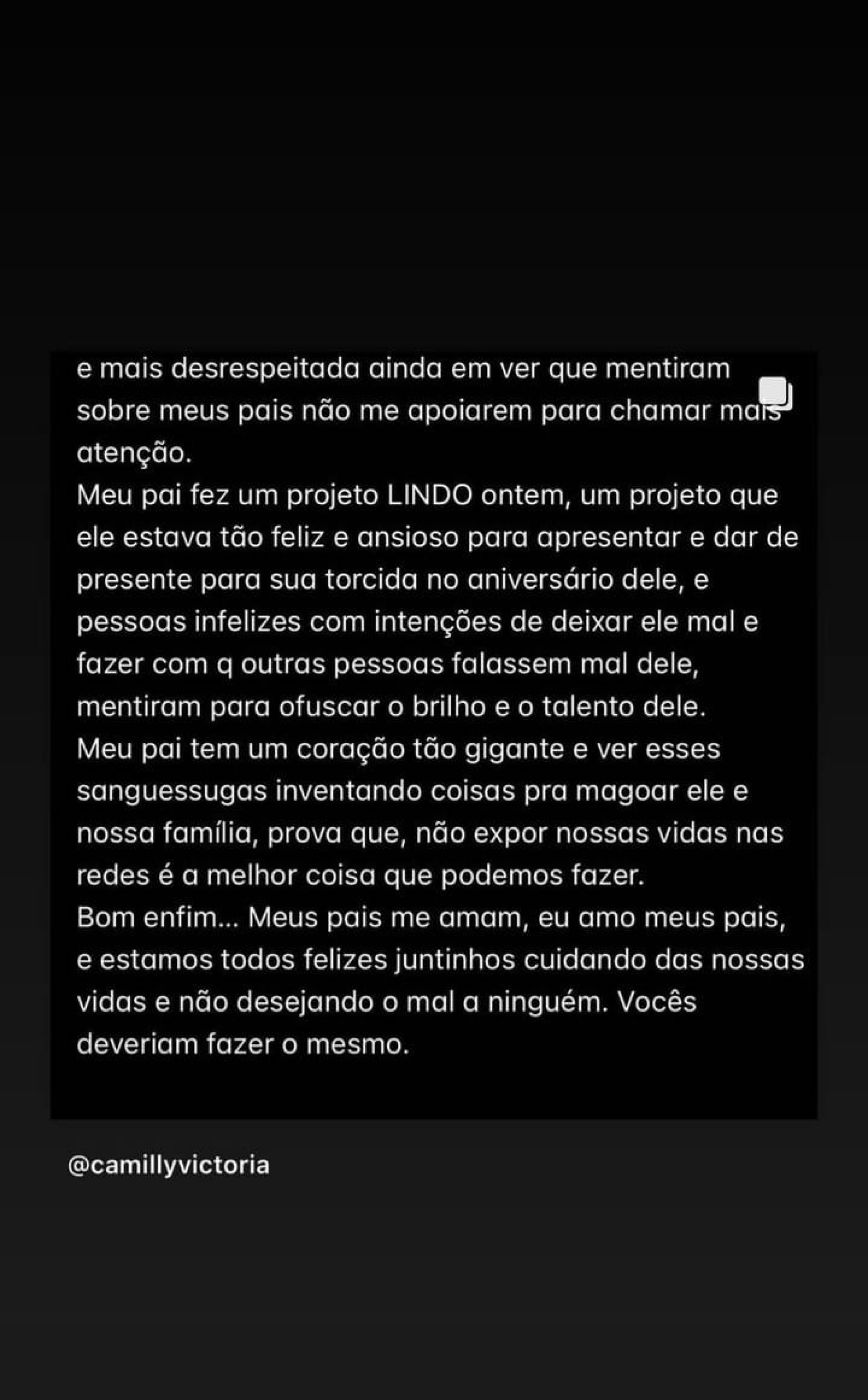 Camilly Victoria ainda lamentou que um drama familiar tenha sido inventando durante o lançamento do novo trabalho de Xanddy. "Meu pai fez um projeto LINDO ontem, um projeto que ele estava tão feliz e ansioso para apresentar e dar de presente para sua torcida no aniversário dele, e pessoas infelizes com intenções de deixar ele mal e fazer com que outras pessoas falassem mal dele, mentiram para ofuscar o brilho e o talento dele", afirmou.