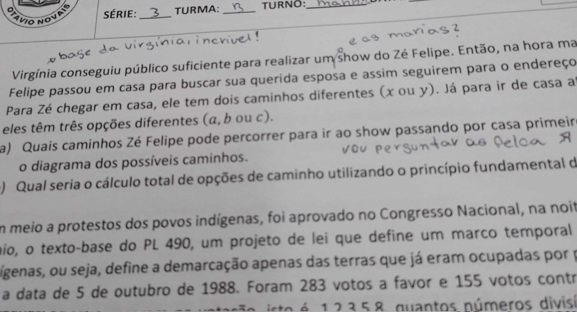 Na questão, que foi aplicada em uma prova do terceiro ano, o professor pede que os alunos calculem quantos caminhos Zé Felipe pode tomar para chegar ao local de seu show. Em outra pergunta, devem mostrar quais as rotas possíveis para o cantor ir ao show passando em casa primeiro para buscar sua "querida esposa" Virgínia.