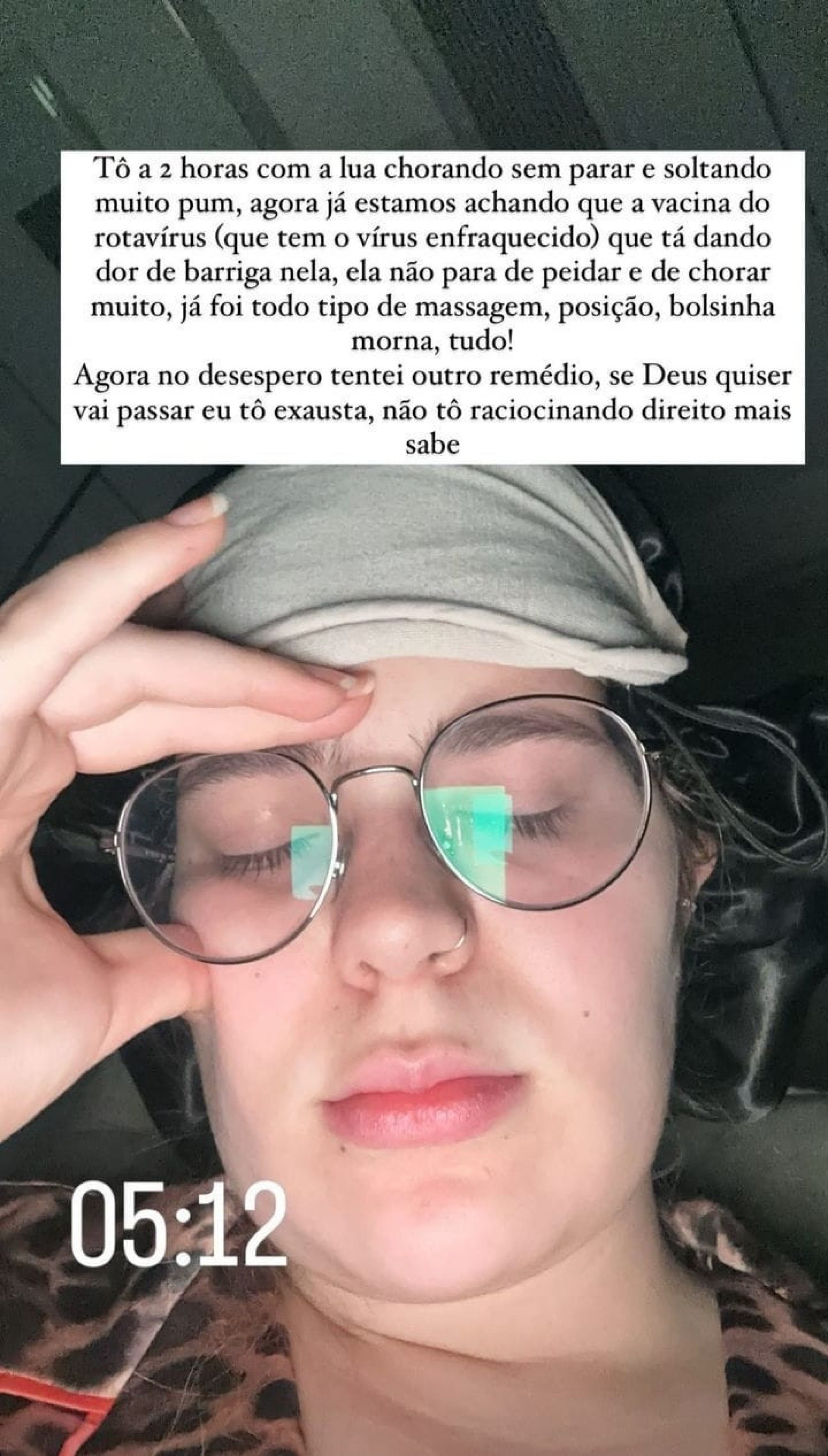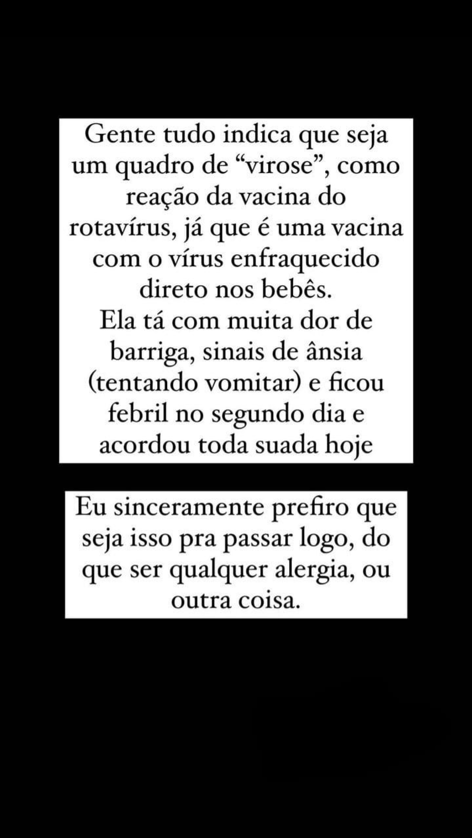 "Já que é uma vacina com vírus enfraquecido direto nos bebês. Ela tá com muita dor de barriga, sinais de ânsia [de vômito] e ficou febril no segundo dia e acordou toda suada hoje. Eu sinceramente prefiro que seja isso pra passar logo, do que ser qualquer alergia, outra coisa", concluiu.