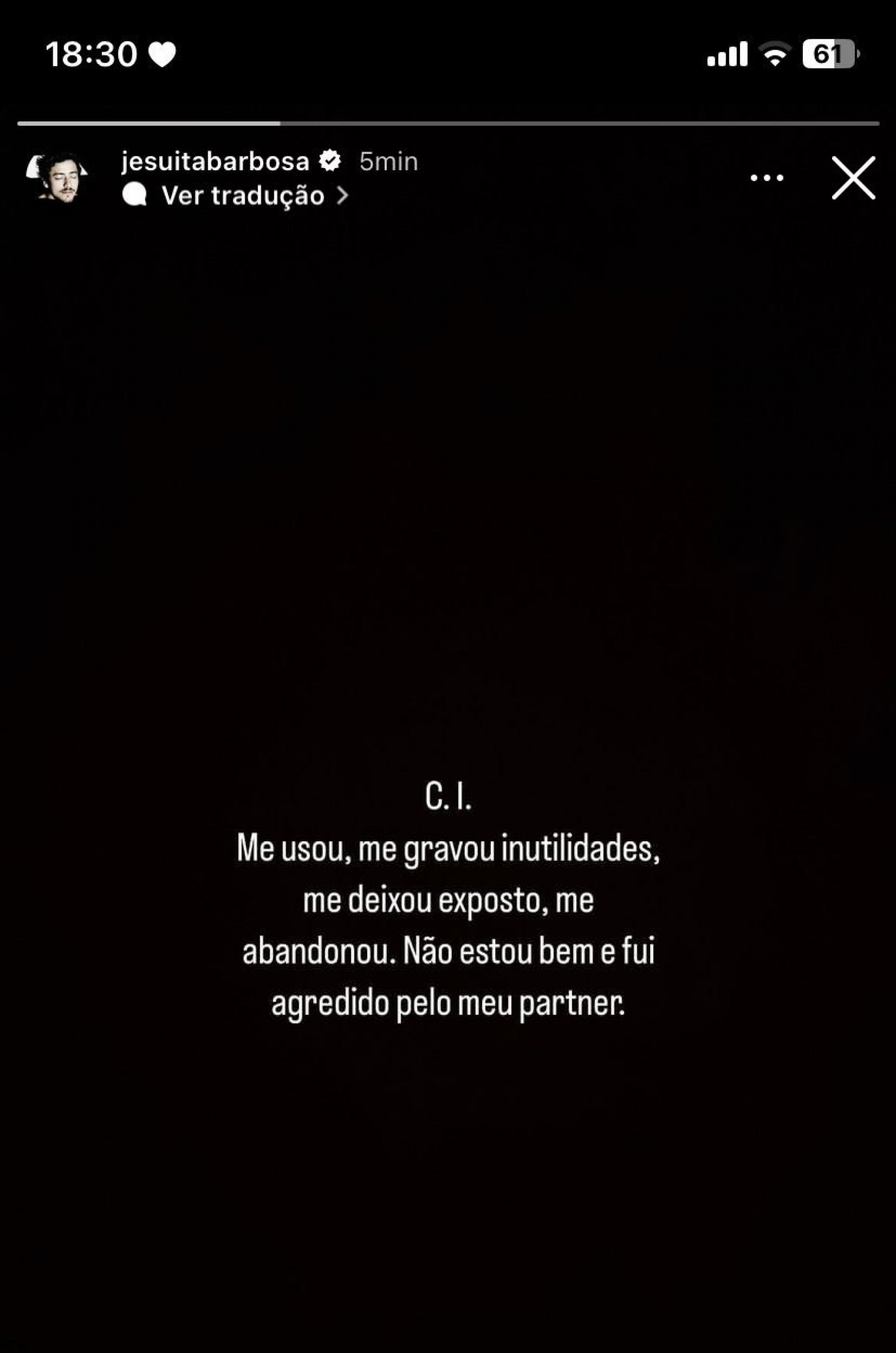 A mensagem enigmática foi apagada logo em seguida de seu perfil, mas prints do post repercutiram nas redes: "C.I. Me usou, me gravou inutilidades, me deixou exposto, me abandonou. Não estou bem e fui agredido pelo meu parceiro", escreveu o famoso. Fãs suspeitam que o ator usou a abreviação C.I. para se referir ao nome e sobrenome do então namorado, apesar das fotos dos dois juntos ainda não terem sido apagadas de suas redes.