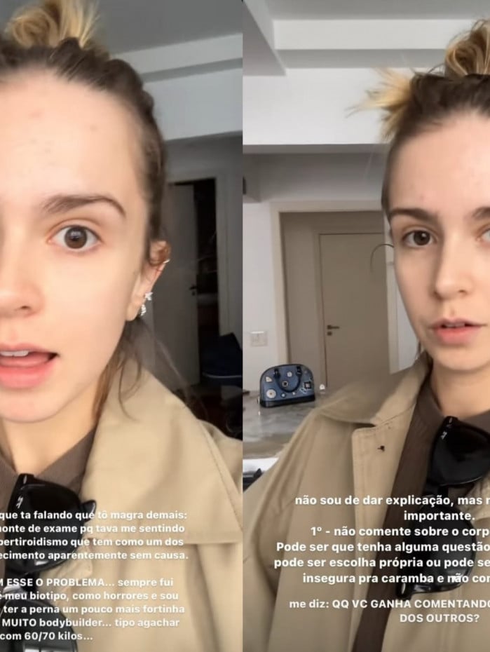 Ela ainda afirmou que comentários sobre o corpo alheio são dispensáveis. "Não se faz comentários sobre o corpo dos outros. Aprende isso. Igual no caso, pode ter uma questão de saúde por trás, pode ser que a pessoa simplesmente goste do corpo dela como é, pode ser que ela seja insegura e não consiga mudar. Por que você vai opinar no corpo dos outros? O que você ganha com isso?", rebateu.
