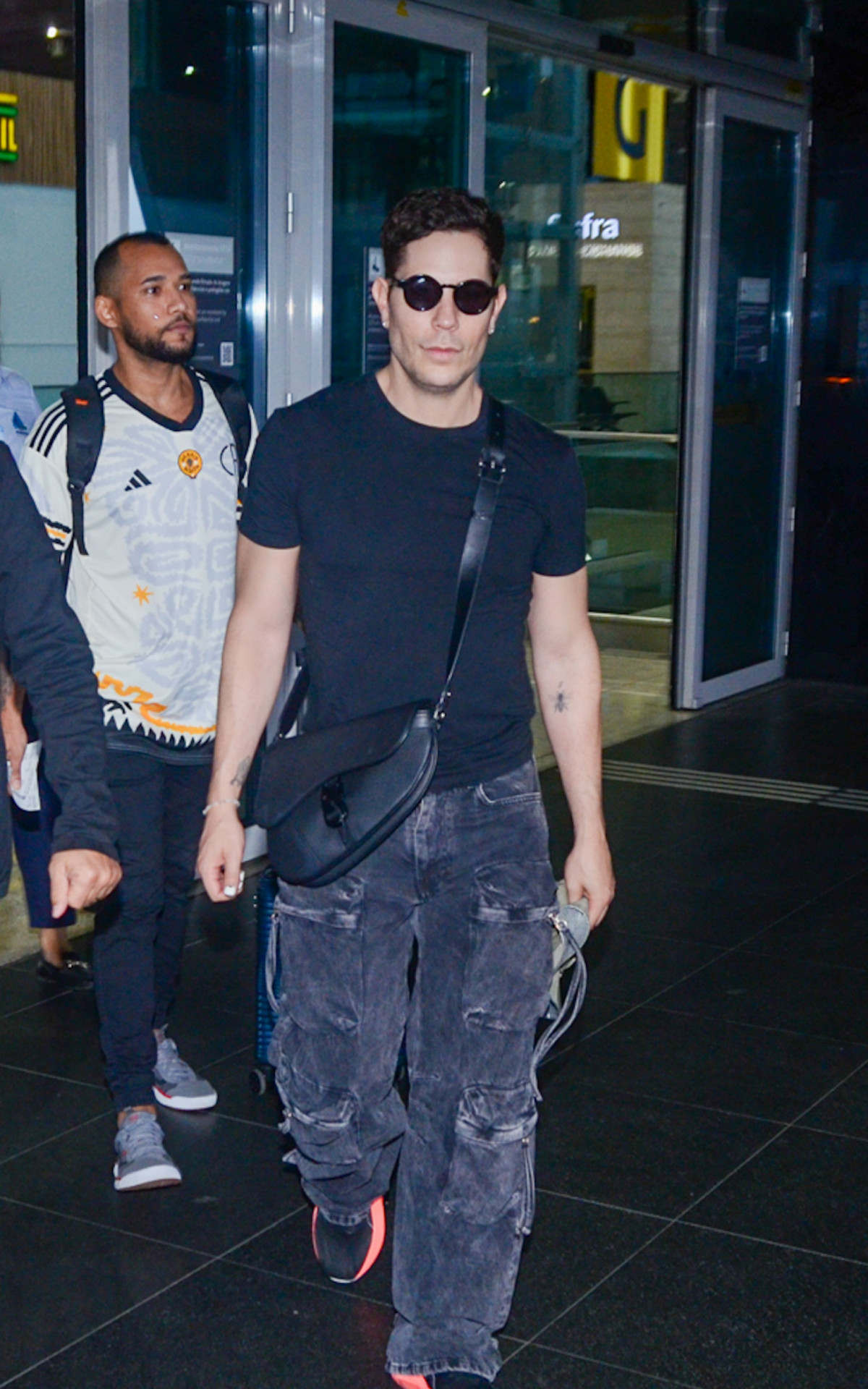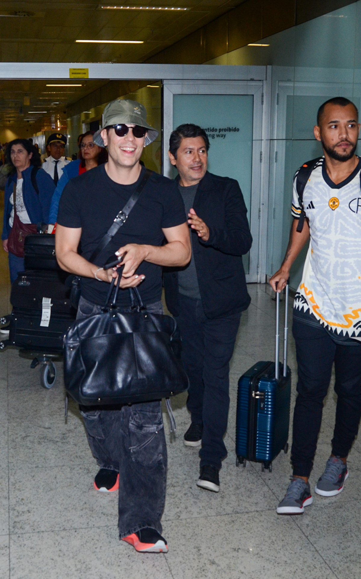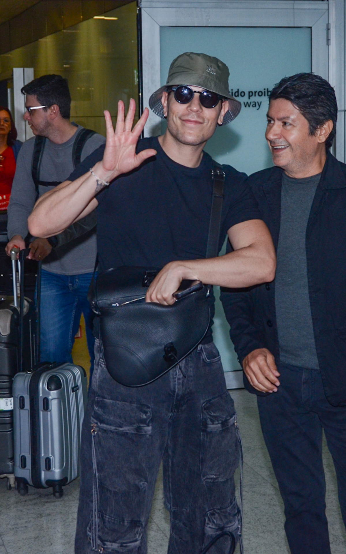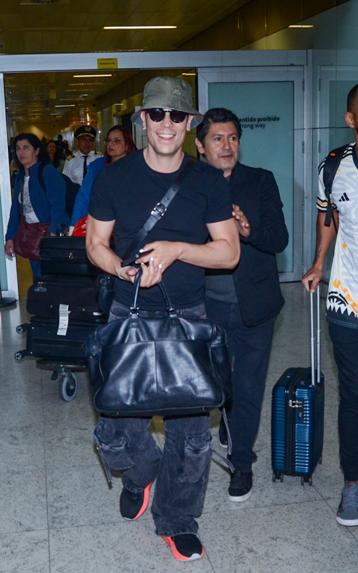 Para a ocasião, ele apostou em um look confortável e completou a produção com óculos escuros e bucket hat
